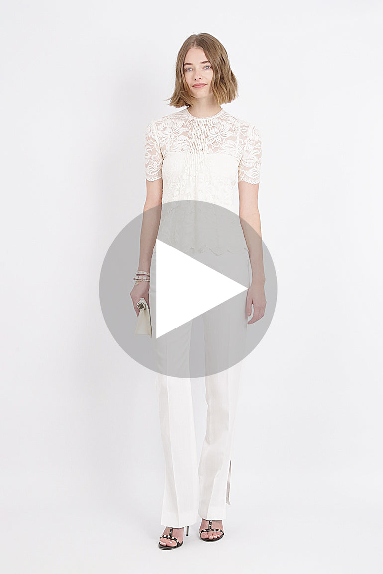 The Rabanne Haut Short Sleeve Top is crafted from an ivory lace and is fitted at the top and pleated underneath the bust. Semi-sheer, this style features a high neckline, short sleeves and a zip closure at the back.