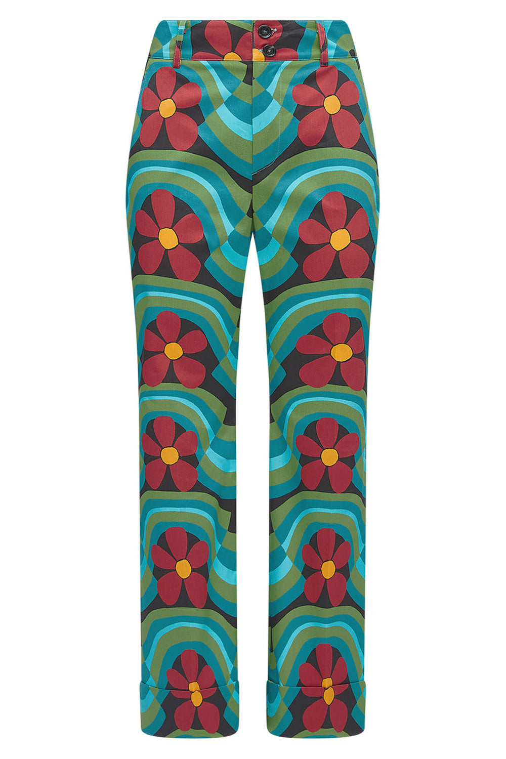 The La Double J Hendrix Pants is crafted from a heavy cotton with a wave and floral print, and is a cropped, high waisted style. This pant features button and zip closures at the waist, belt loops, front pockets on either side and an all-over bright floral print.