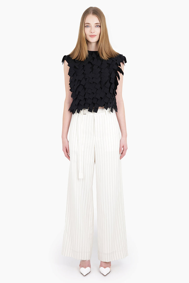 Featuring an interlock twill weave check pattern, this pant boasts a concealed front hook and zip fastening. Its high waist is accentuated by a detachable waist belt, and there are two side slit pockets for added convenience. Additionally, there is pressed crease satin trim, dart detailing at the rear, and two rear button-fastening pockets. The pant also boasts a flattering wide leg fit.