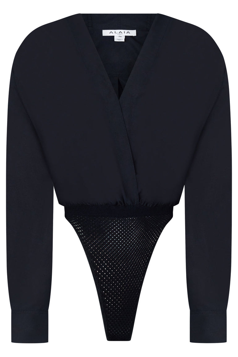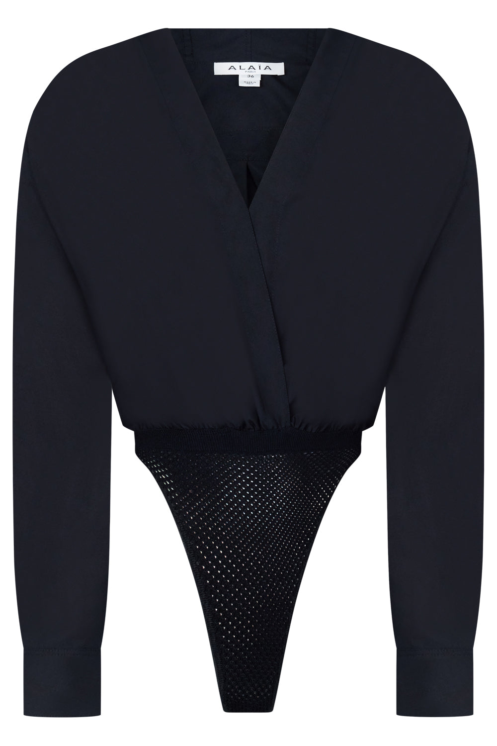 The Alaia Hooded Poplin Bodysuit features a deep V-neckline and long sleeves with cuffs, it's iconic and carry over shape elastic waistband and viscose/polyester blend bottom. Made From Signature Japanese Poplin.