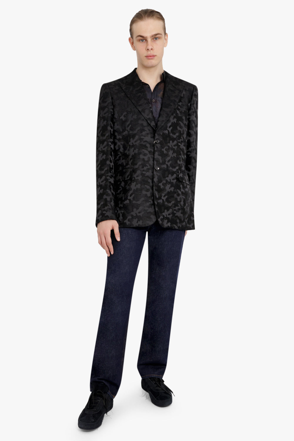 Jacquard cloth blazer with full-length wide peak lapels, a front button fastening, two front flap pockets, jetted chest pocket, long sleeves with buttoned cuffs and a straight hem; woven with acetate and polyester.
