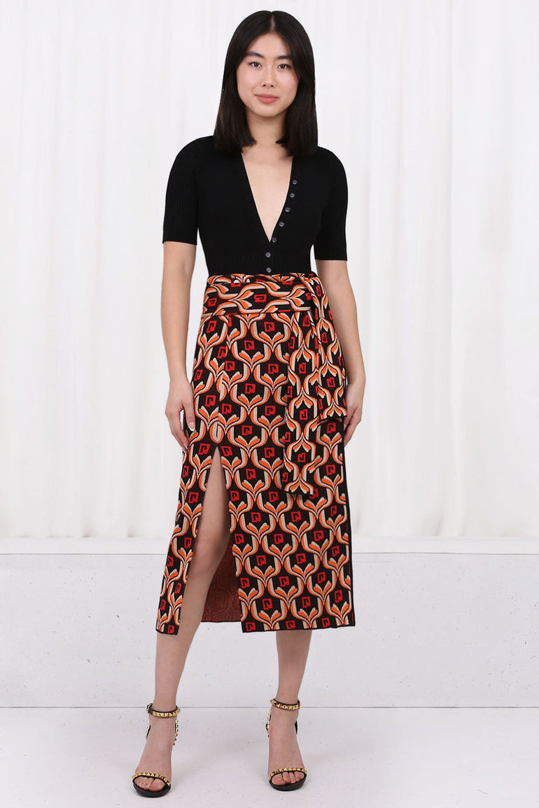 The Rabanne Jacquard Knit Skirt is crafted from a knit fabrication featuring an all-over tapestry print. This style features a wrap around design with a tie that can be tied at the back or side, a side split and signature silver button details.