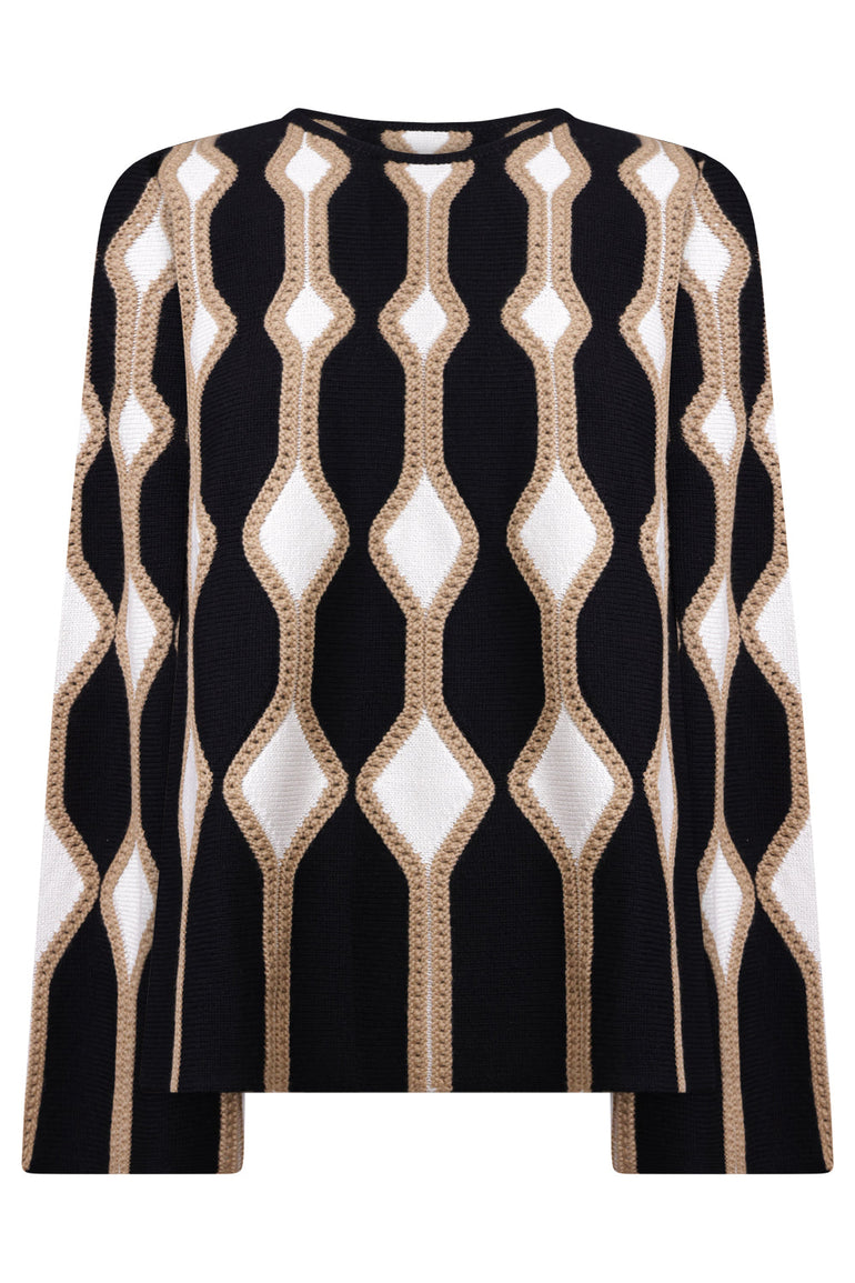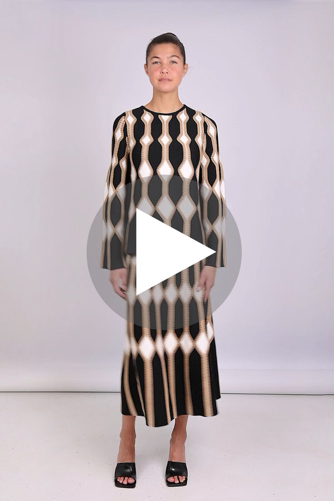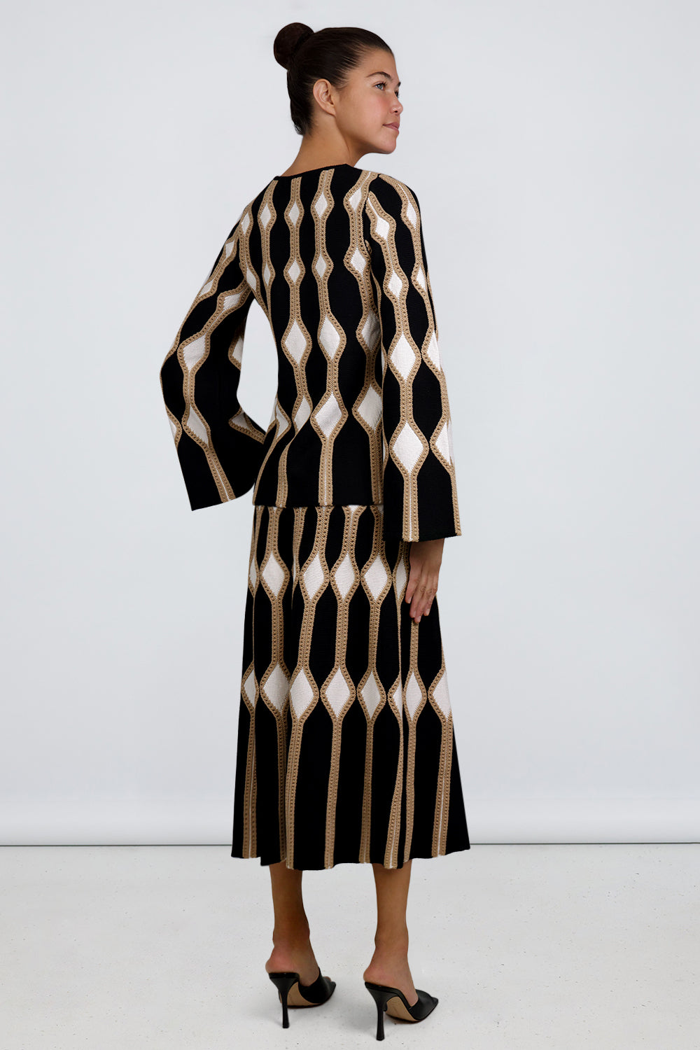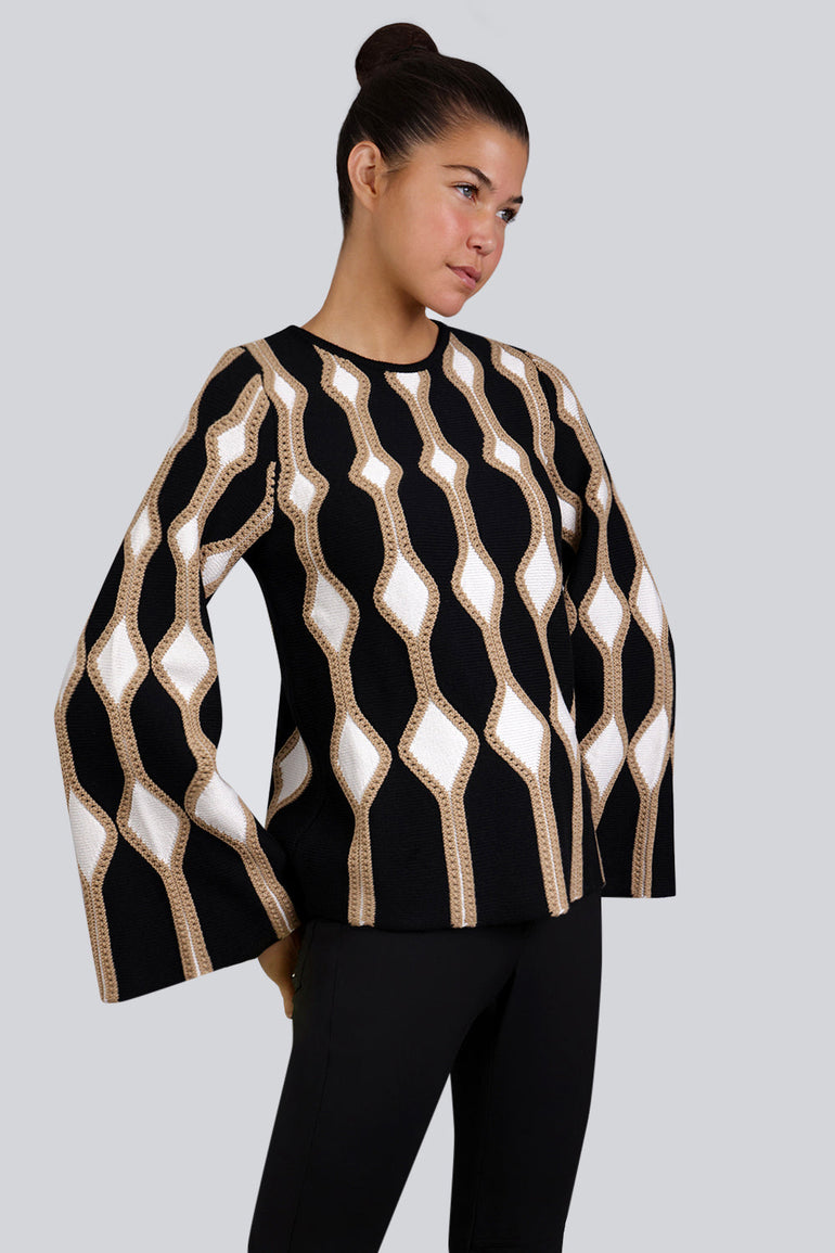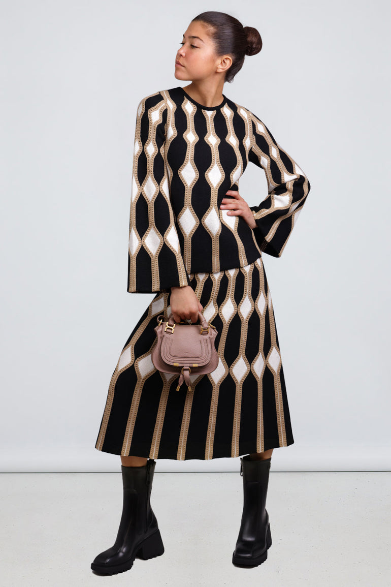 This trumpet-sleeve sweater is a fitted, crew-neck piece made from a Renaissance-inspired wool and silk intarsia with a graphic, modernist allure. The all-over Chloé-designed motif summons a checkerboard pattern – a recurring theme in the Fall-Winter 2023 collection.