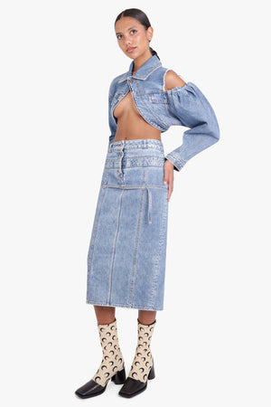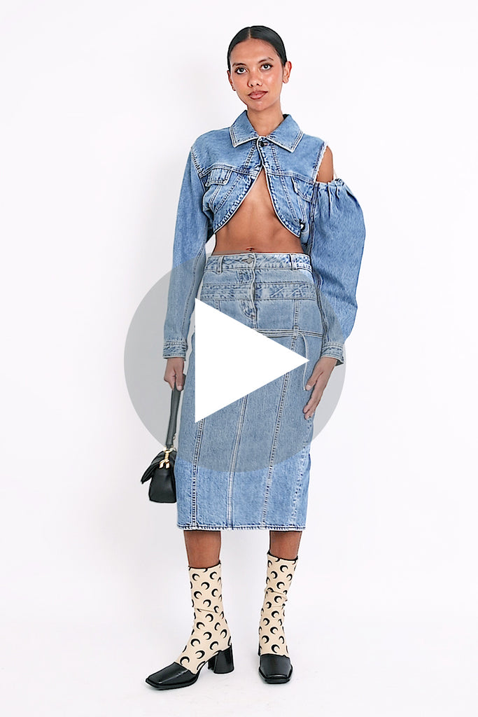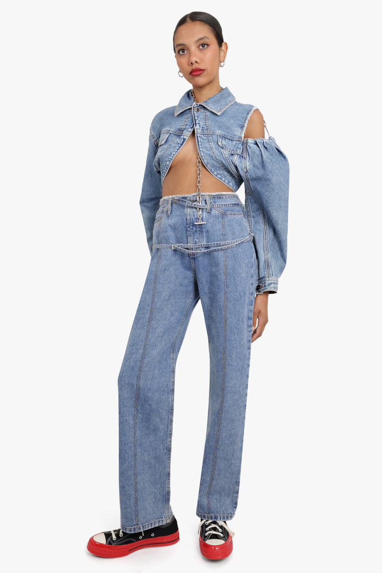 Jacquemus brings a characterful vision of French fashion to the design of each new collection. With its cropped cut in faded denim, the Chemise de Nîmes Linon stands out with its different elements, such as its openwork details on one shoulder, its frayed edges and a puffy sleeve.