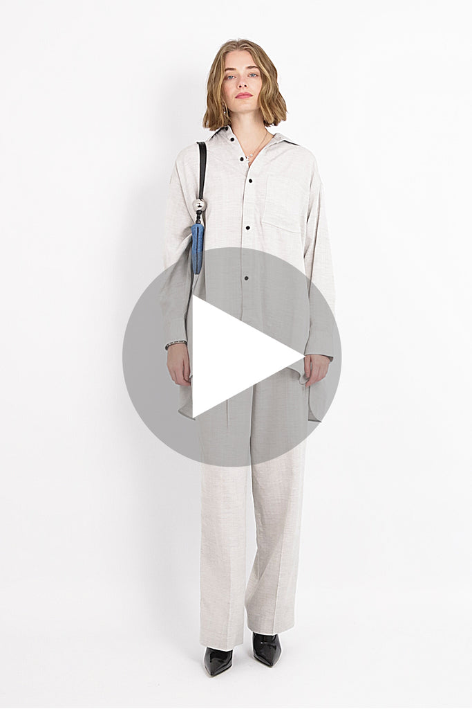 La Chemise Poche features an interwoven shirt in light grey with a mélange effect design. Pleat detailing at the sleeves, a logo patch on the rear, and a classic collar add to its sophisticated look. The drop shoulder, long sleeves with buttoned cuffs, and short side slits make it comfortable to wear. It also includes a chest patch pocket, front button fastening, and a high-low curved hem. The shirt remains unlined for a lightweight and breathable feel.