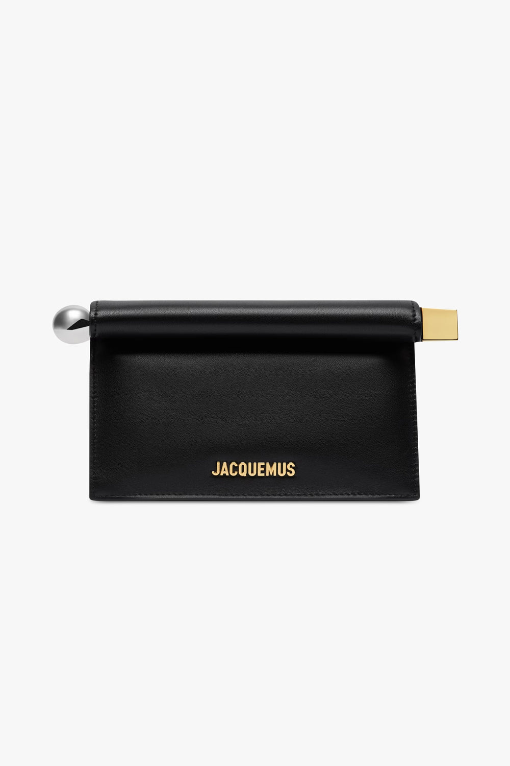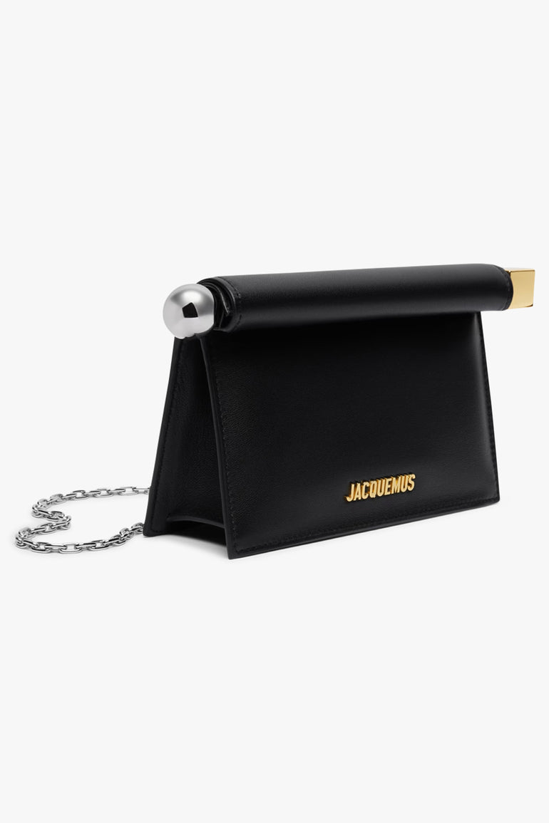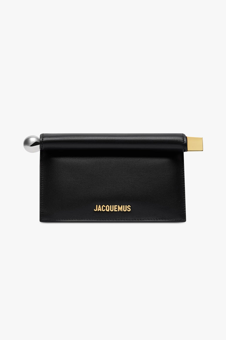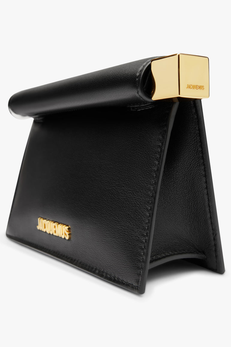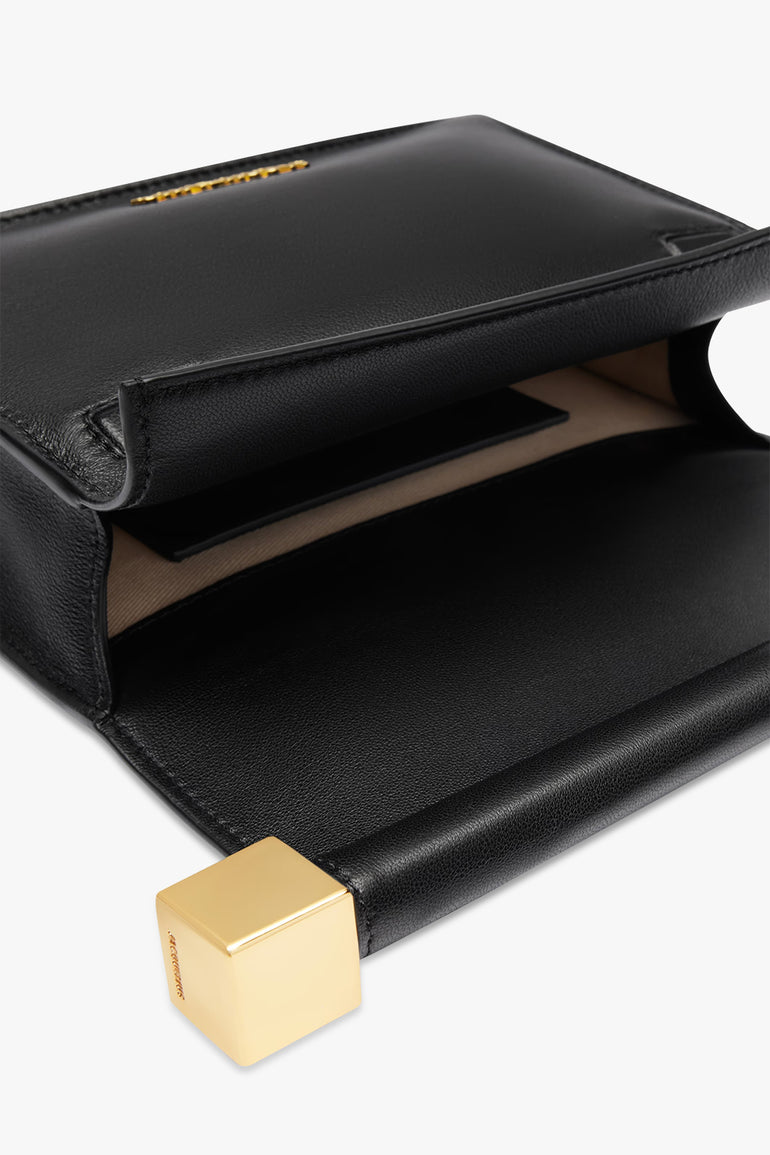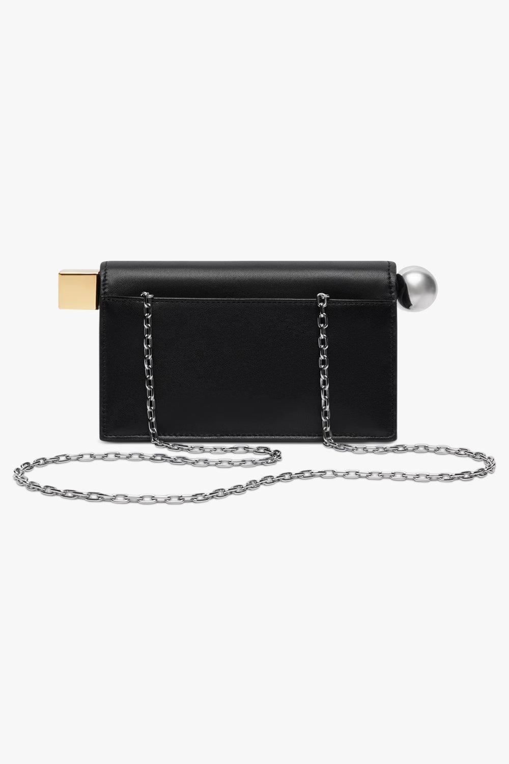 Expertly crafted from Nappa leather, this stylish mini clutch features a unique folded design that effortlessly rolls open to reveal its spacious interior. The clutch is secured with a large silver metal circle and gold square closure, as well as a convenient magnetic closure. For added functionality, it also includes an interior card pocket and is fully lined in soft cotton. Adorned with a gold metal logo and hardware, this clutch exudes elegance and sophistication.