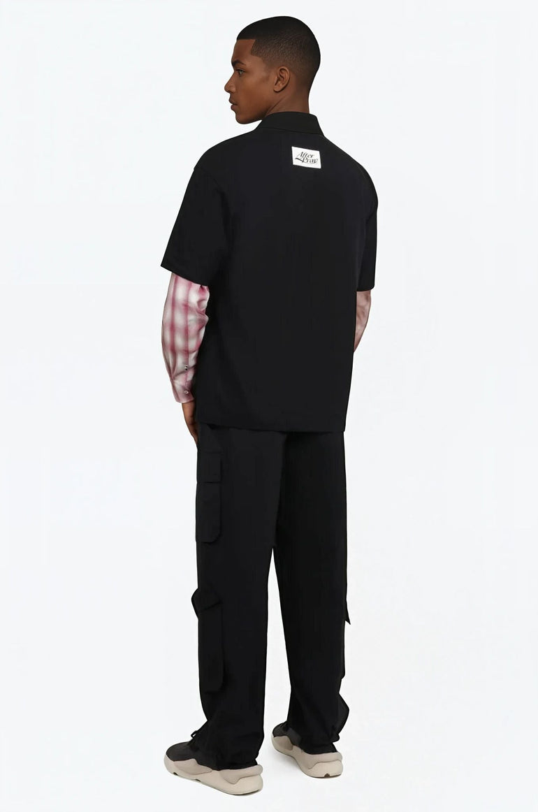 A classic t-shirt with a twist. This classic black t-shirt features a grungy twist with a double layered design with the added red and white tartan long sleeve.