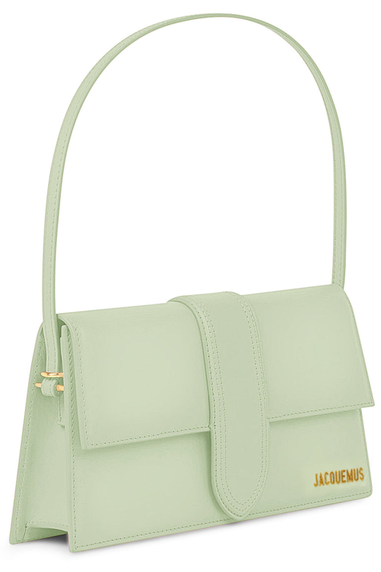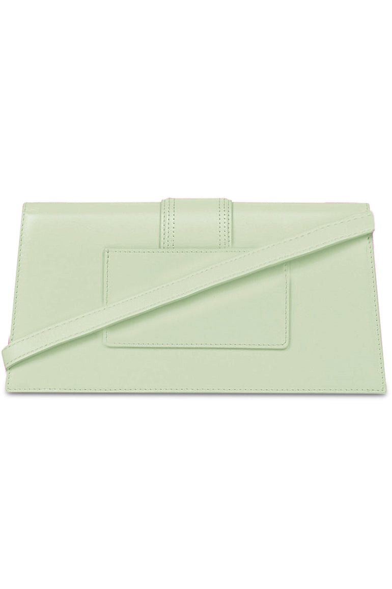 The Jacquemus Le Bambino Long in  Light Green is a long envelope shoulder bag crafted from a leather fabrication. This bag features magnetic flap closure, a slim non-adjustable shoulder strap, an interior card pocket, a back patch pocket, inner lining and a gold hardware with a gold metal JACQUEMUS logo at the front.