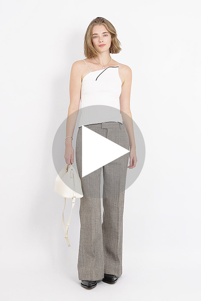 The Le Haut Maille Plisse in Black features a pleated knit design with a fitted shape and contrast neckline and hem. The folded tank top also includes spaghetti straps, a draped neckline, and a D-ring on the back for added style.