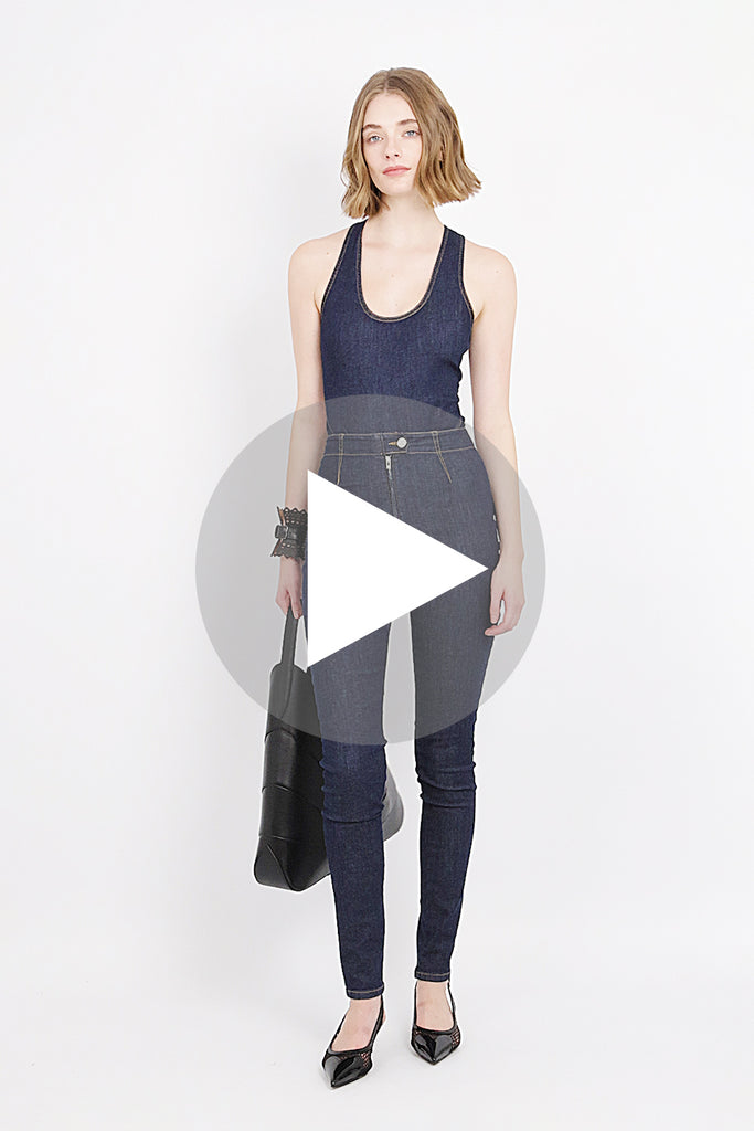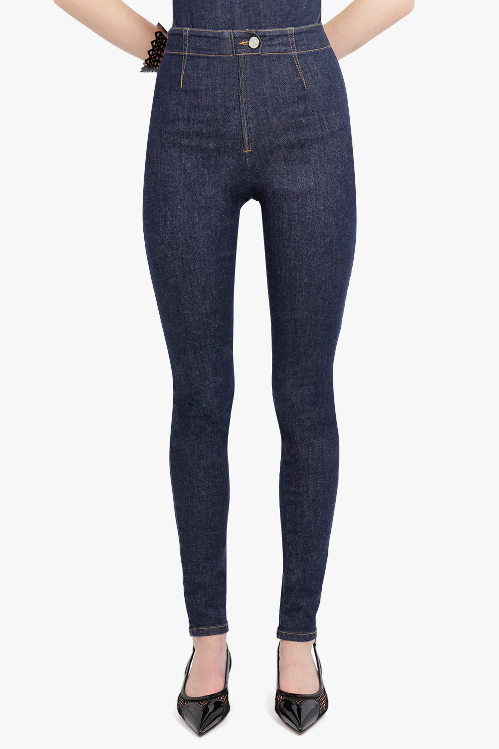 Expertly made with stretch denim, these leggings boast a stirrup design, back darts, and a snug fit. The addition of unstitched details complete with a zip and button for added closure.