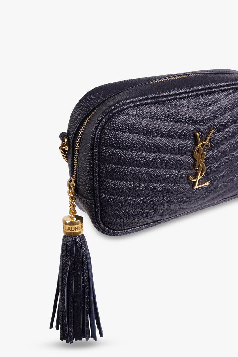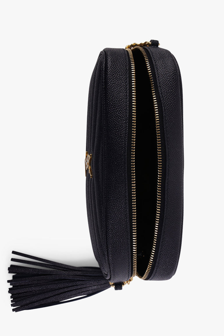 The Saint Laurent Lou Mini Camera Bag is a monogram shoulder bag featuring a gold chain strap, leather tassel zipper, interlaced YSL initials in metal at the centre and quilted overstitching.