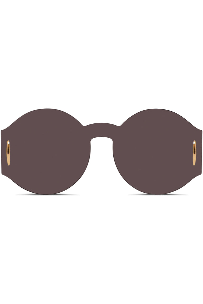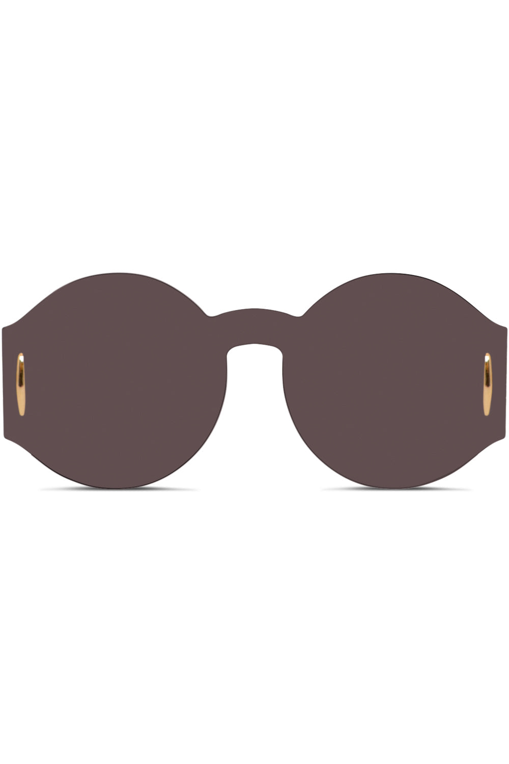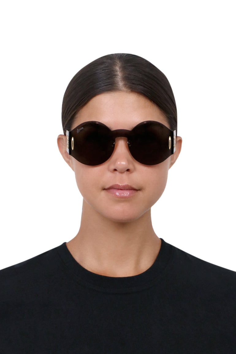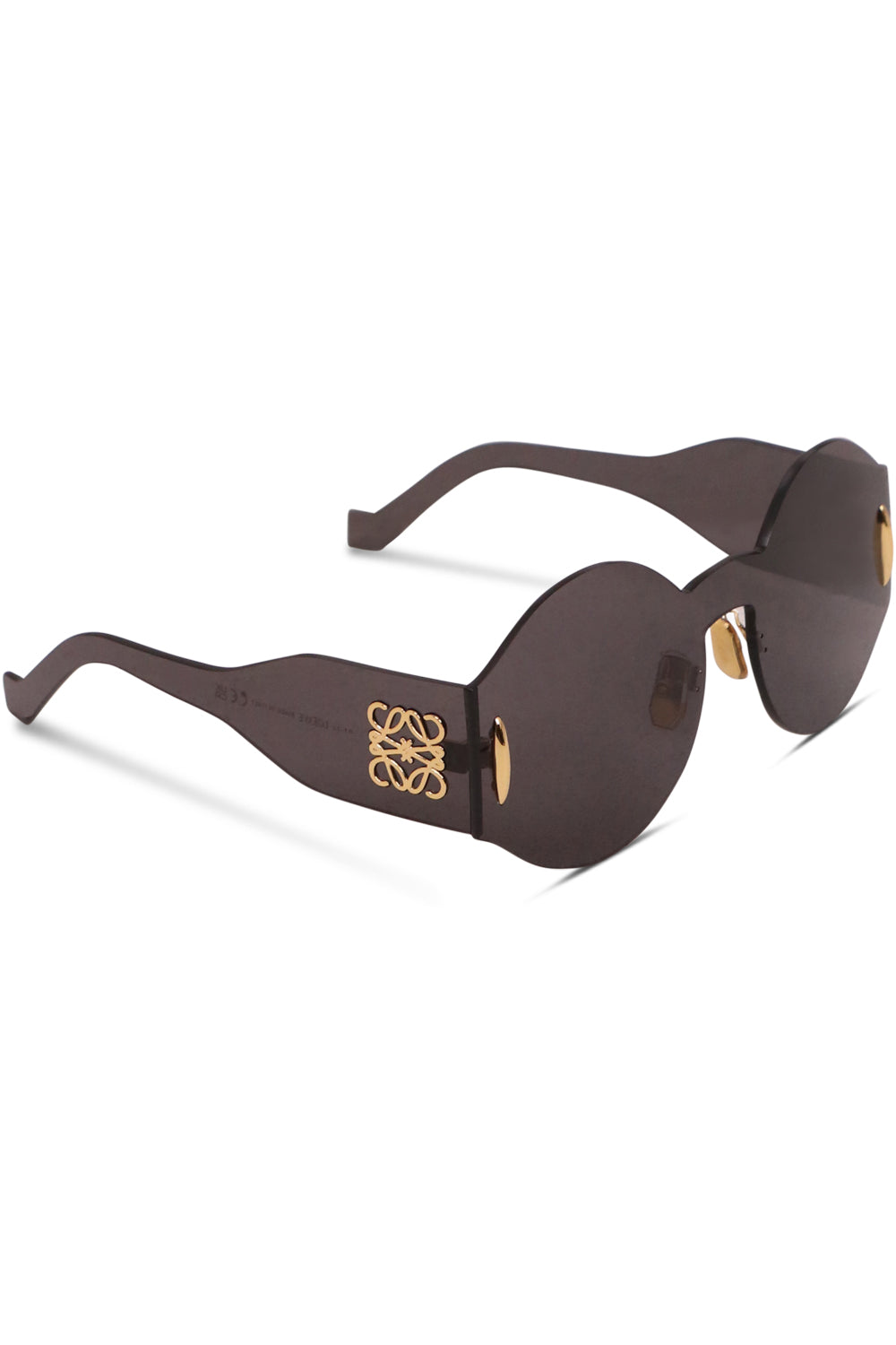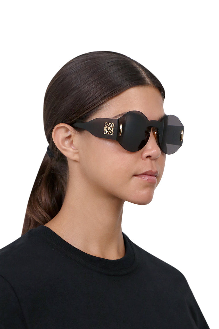 The Loewe Round Mask Sunglasses are crafted from acetate and are a large circular shape with wide arms, and the logo in gold on the temples.