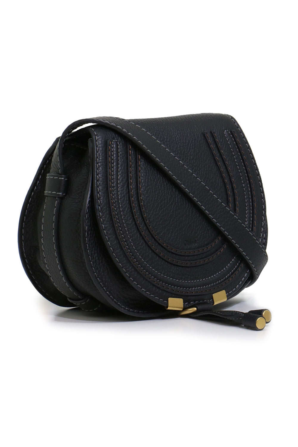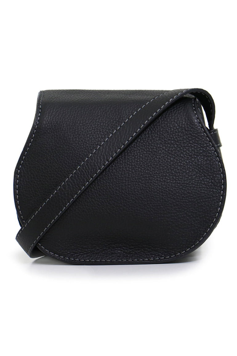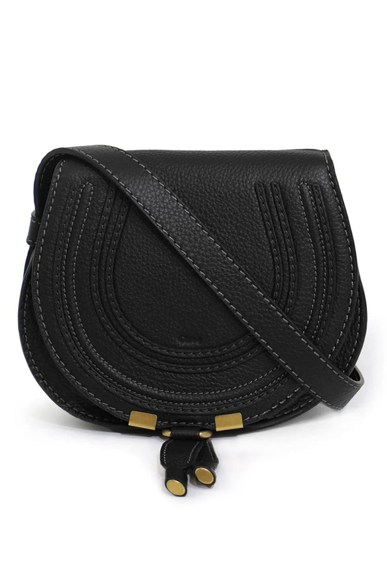 The Chloé Marcie Small Bag is a structured grained calfskin shoulder bag. True to the iconic Marcie line, this practical and compact bag combines a distinct 70's spirit with a romantic, bohemian touch. The harmonious mix of a clean top-line and round silhouette is typical of the Maison's play on masculine and feminine notes.It features a foldover flap with cinch fastening at main compartment, embossed logo and concealed welt pocket at face. The luxurious small grain calfskin is embellished with saddle stitches for equestrian appeal, while the glint of brass hardware and dangling tassel bring a feminine flourish.