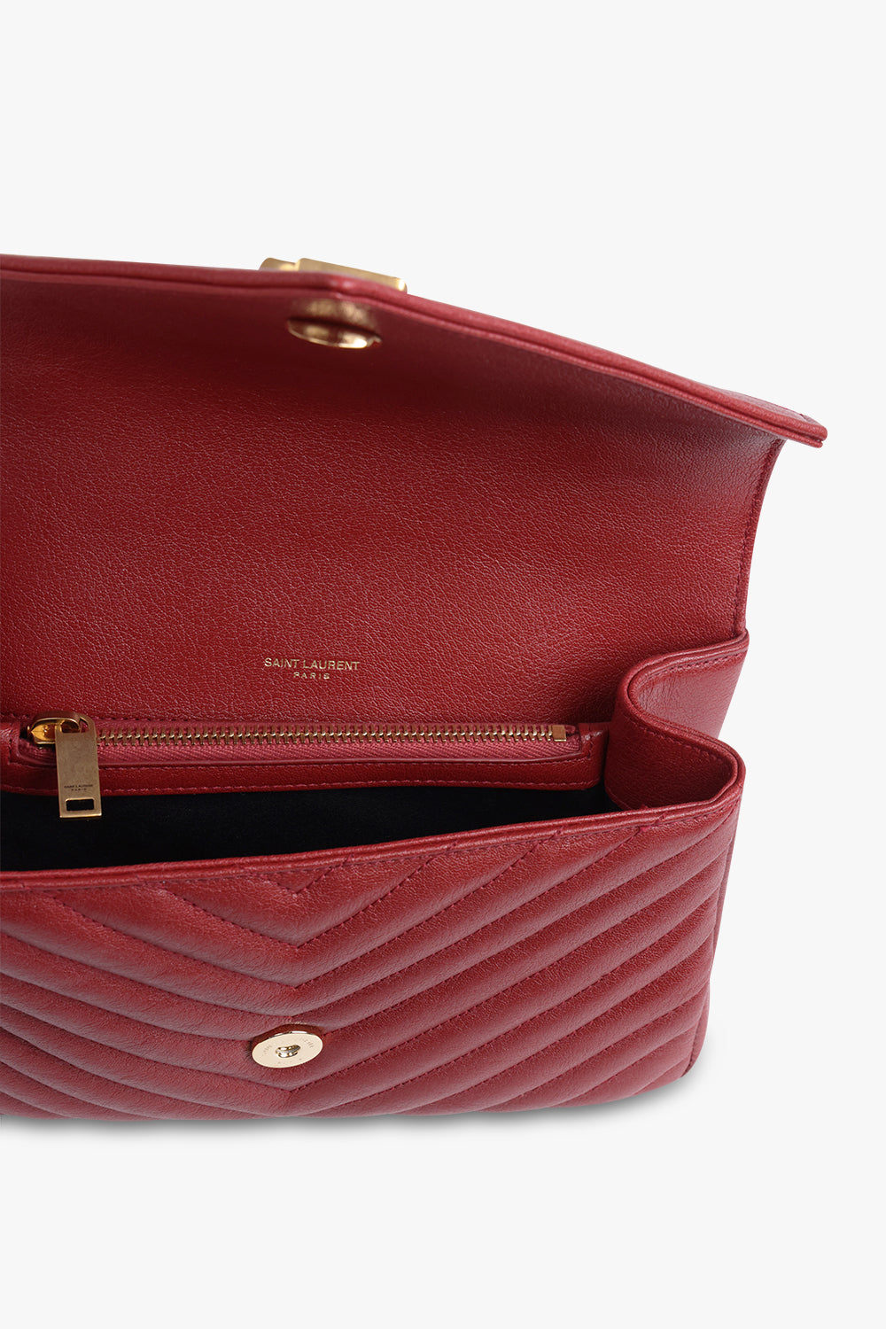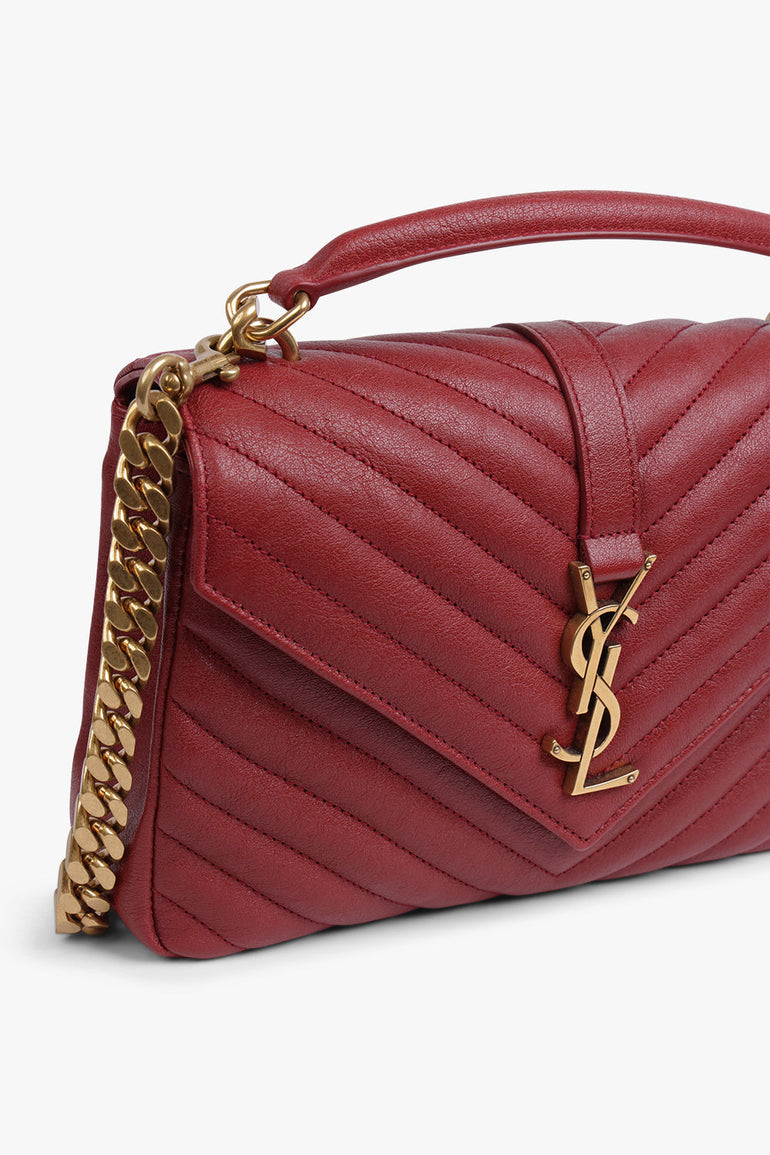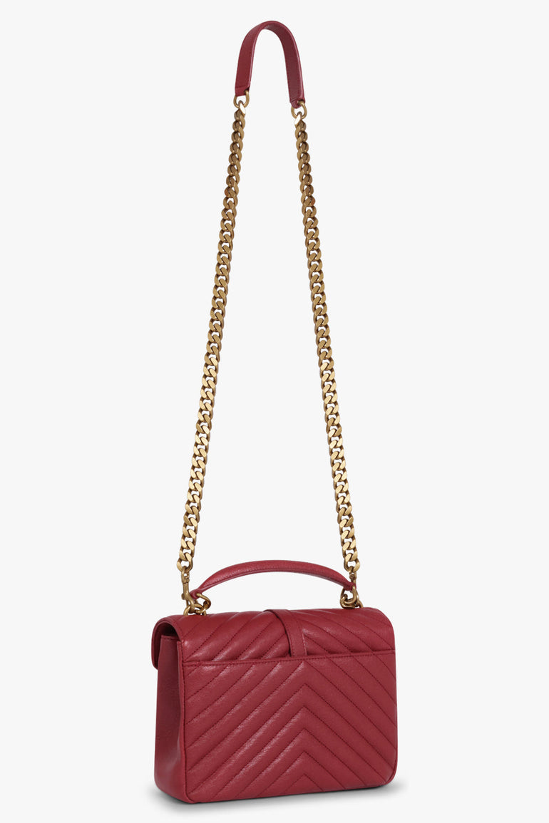 The Saint Laurent Medium College Bag in Opyum Red is adorned with a removable strap in leather and a metallic chain, top handle, buckle closure crafted with a interlocking YSL signature in brushed gold hardware and matelassé stitching.