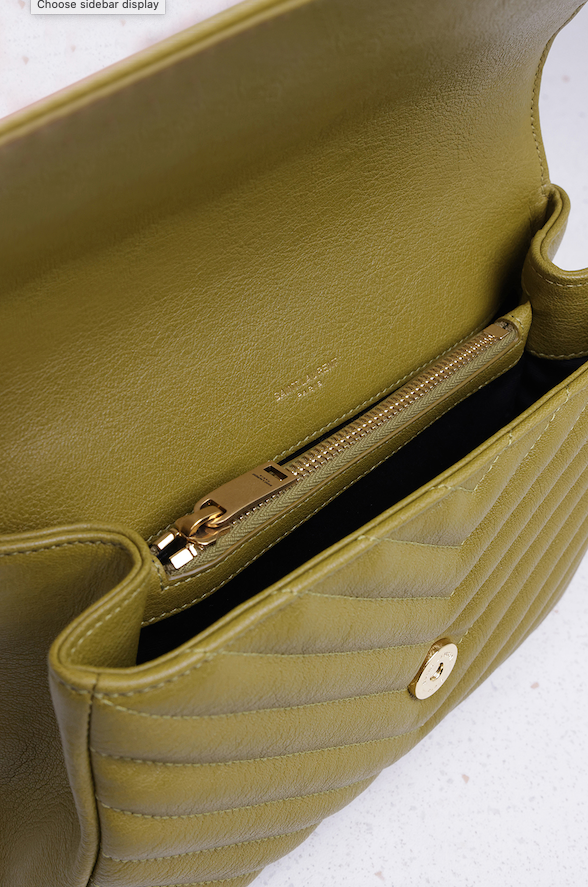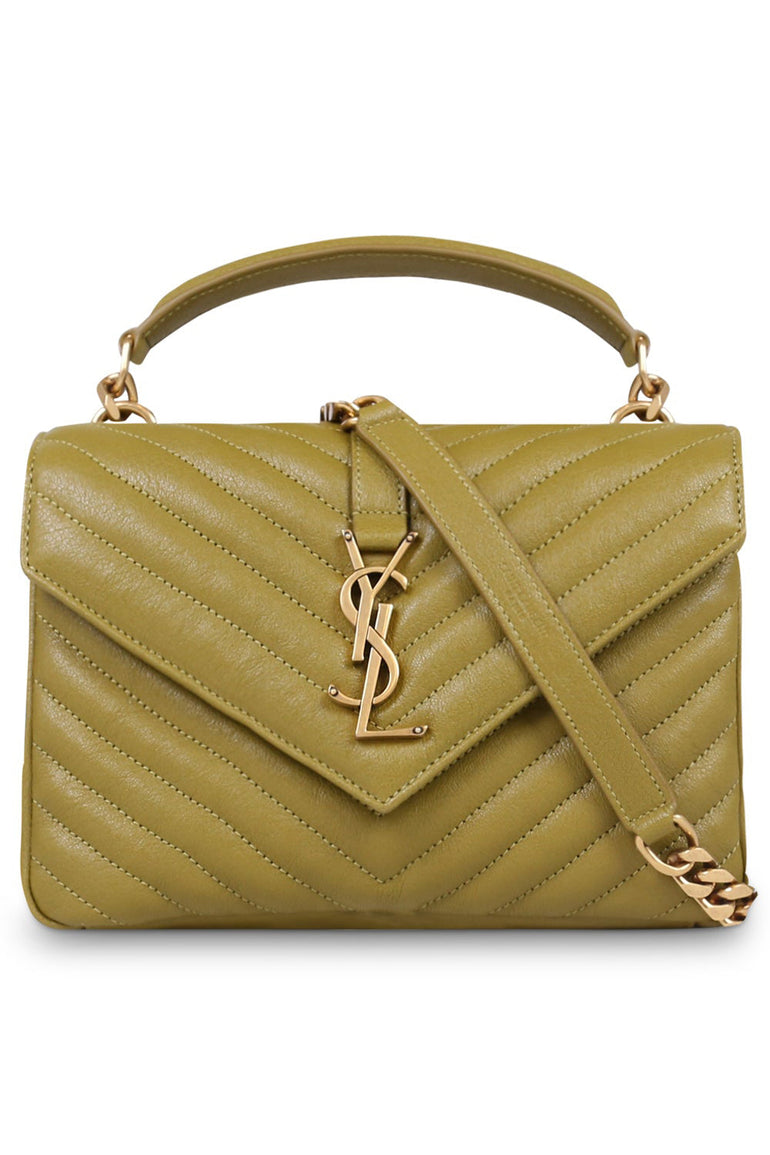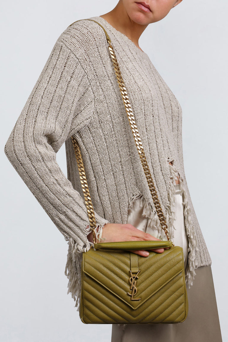 The Saint Laurent College Bag is adorned with a removable strap in leather and a metallic chain, top handle, buckle closure crafted with a interlocking YSL signature in gold-tone hardware and matelassé stitching.