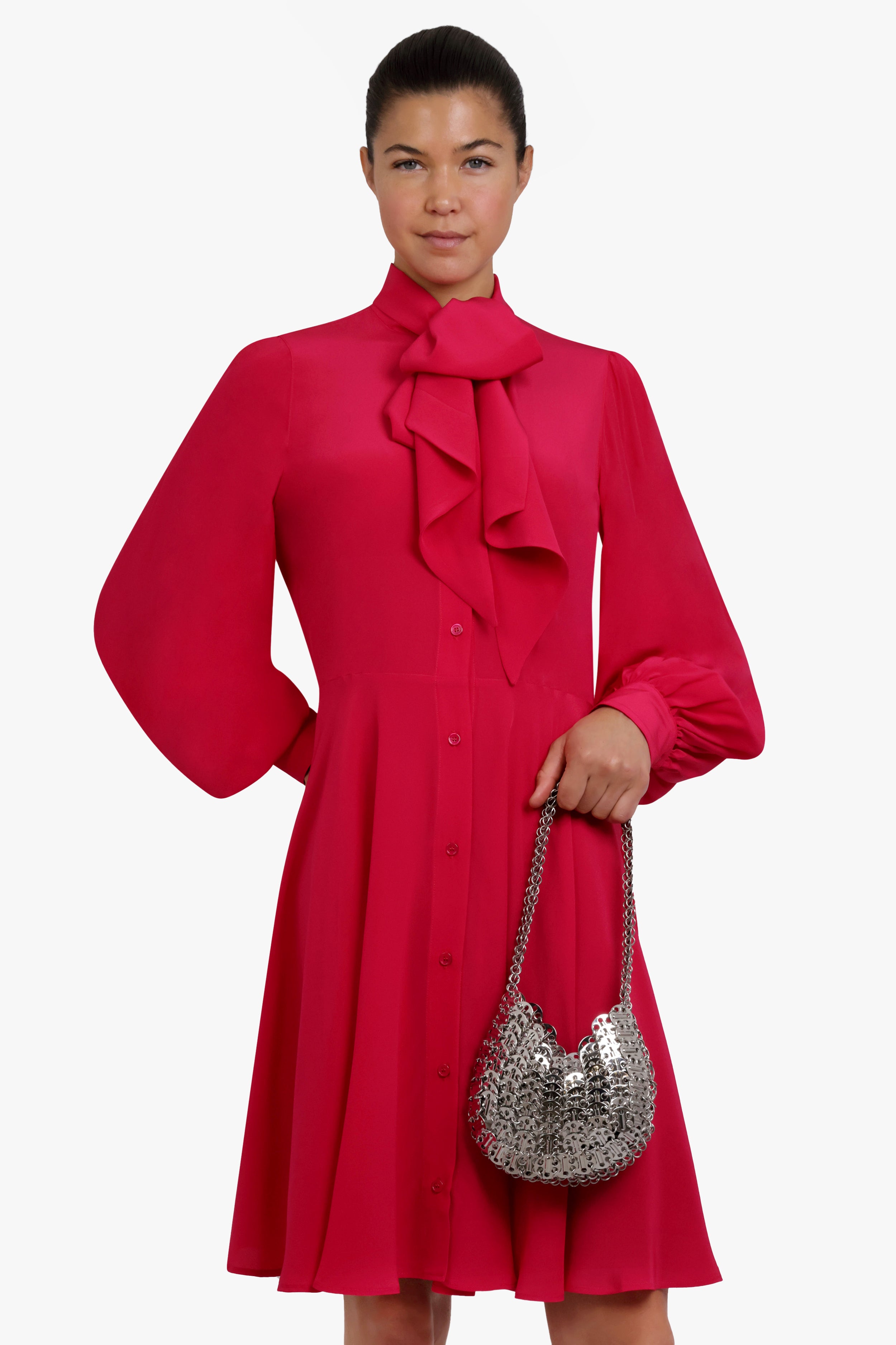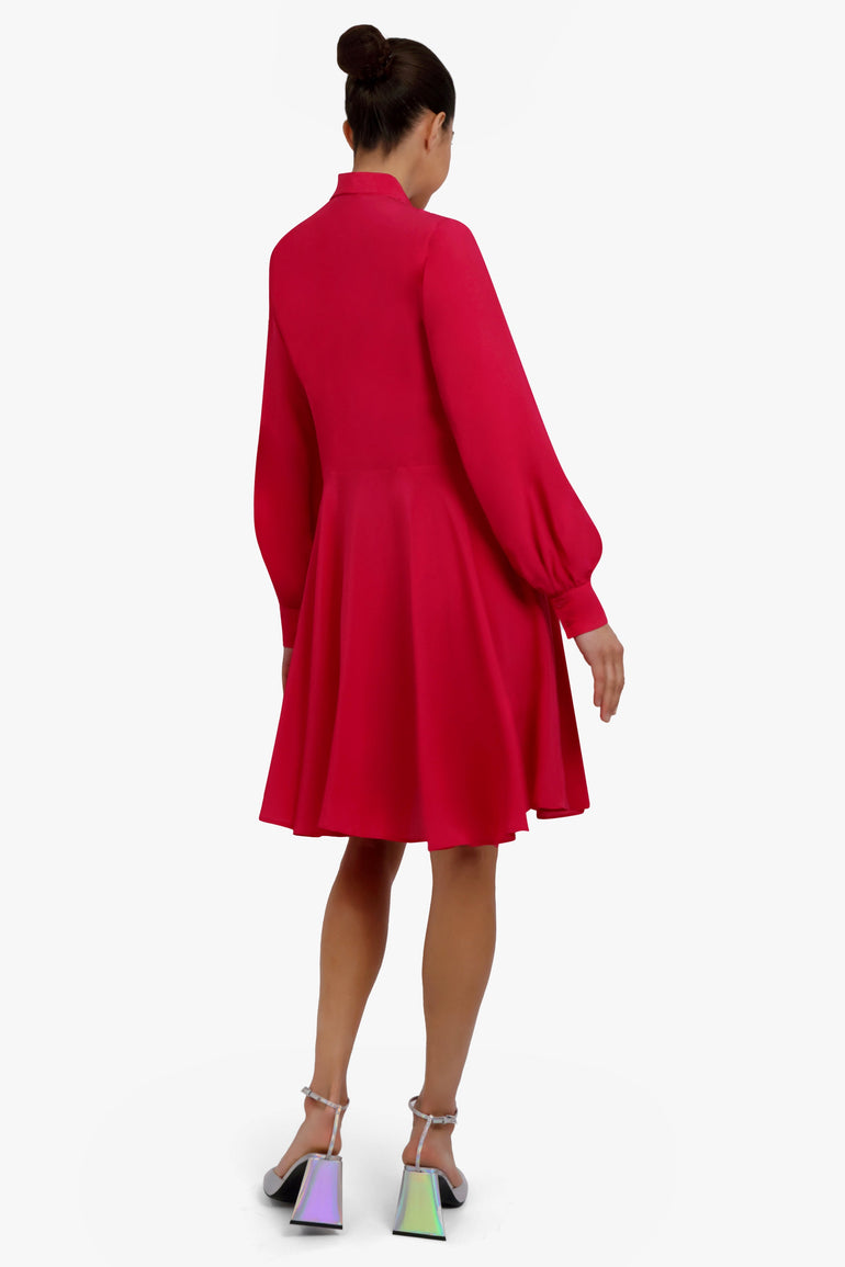 Midi Crepe De Chine Shirt Dress With Puff Sleeves And Neck-Tie It adds a touch of sophistication to any look while still remaining chic and modern. With its lightweight fabric, this dress won't weigh you down, making it perfect for summer days or special occasions.