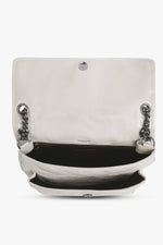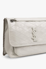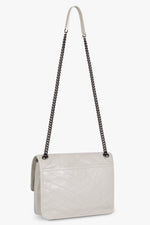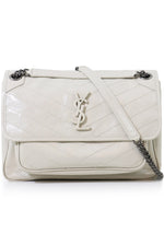 The Saint Laurent Niki Medium Quilted Shopper Bag is made of a supple calfskin leather. It features tonal YSL hardware. Crafted from vintage-effect crinkled leather, this Niki shoulder bag features a fold over top with magnetic closure, a chrome chain and leather strap and a tonal logo plaque. Product Details: Please note this item features a deliberate crease effect.