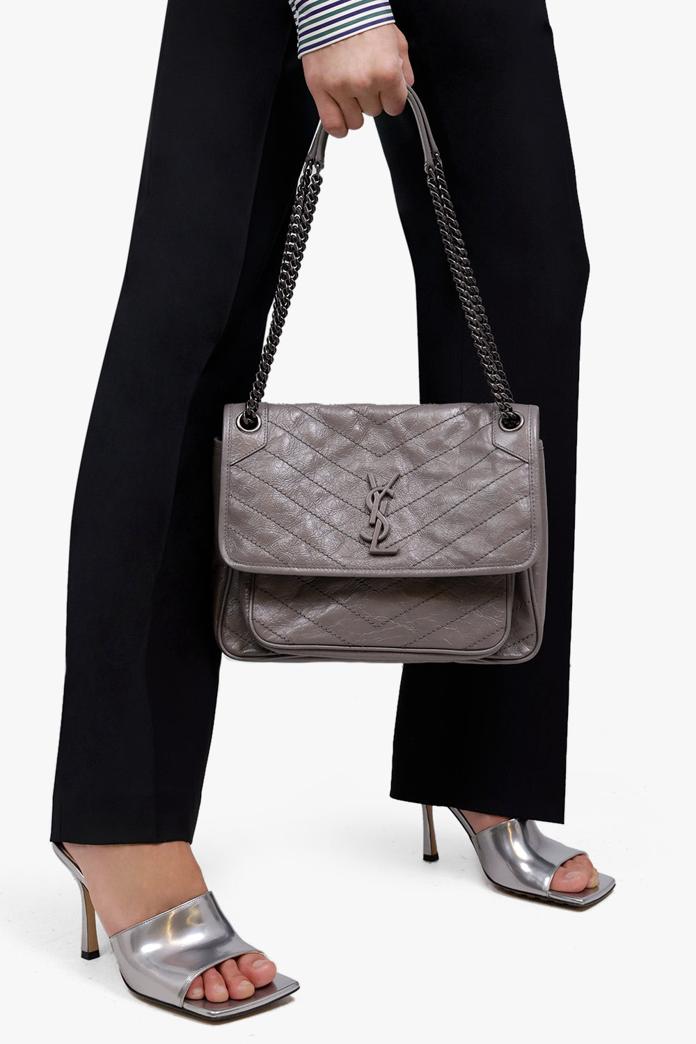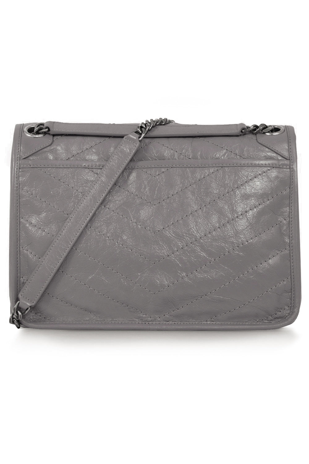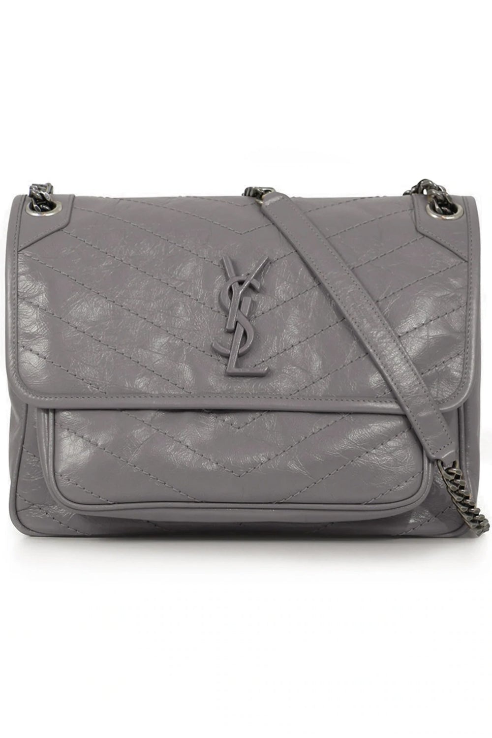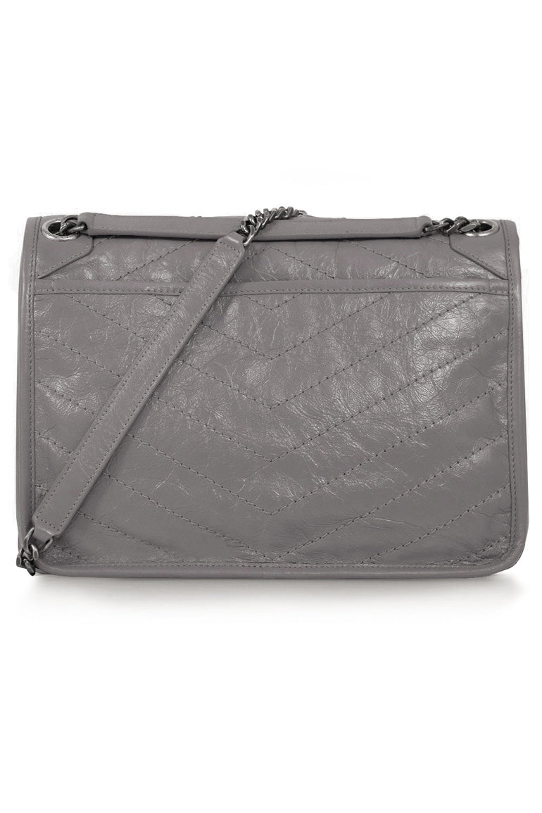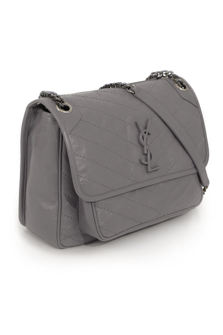 The Saint Laurent Niki Medium Quilted Shopper Bag is made of a supple calfskin leather. It features tonal YSL hardware. Crafted from vintage-effect crinkled black leather, this Niki shoulder bag features a foldover top with magnetic closure, a chrome chain and leather strap and a tonal logo plaque. Product Details: Please note this item features a deliberate crease effect.