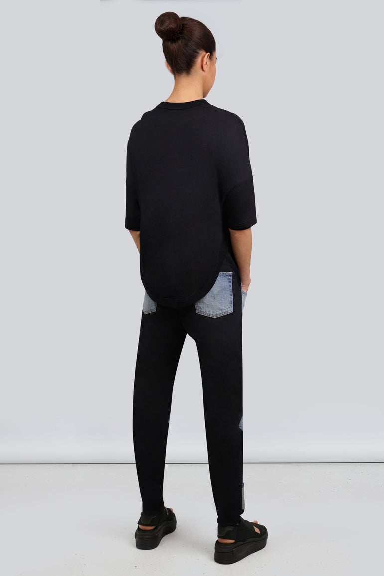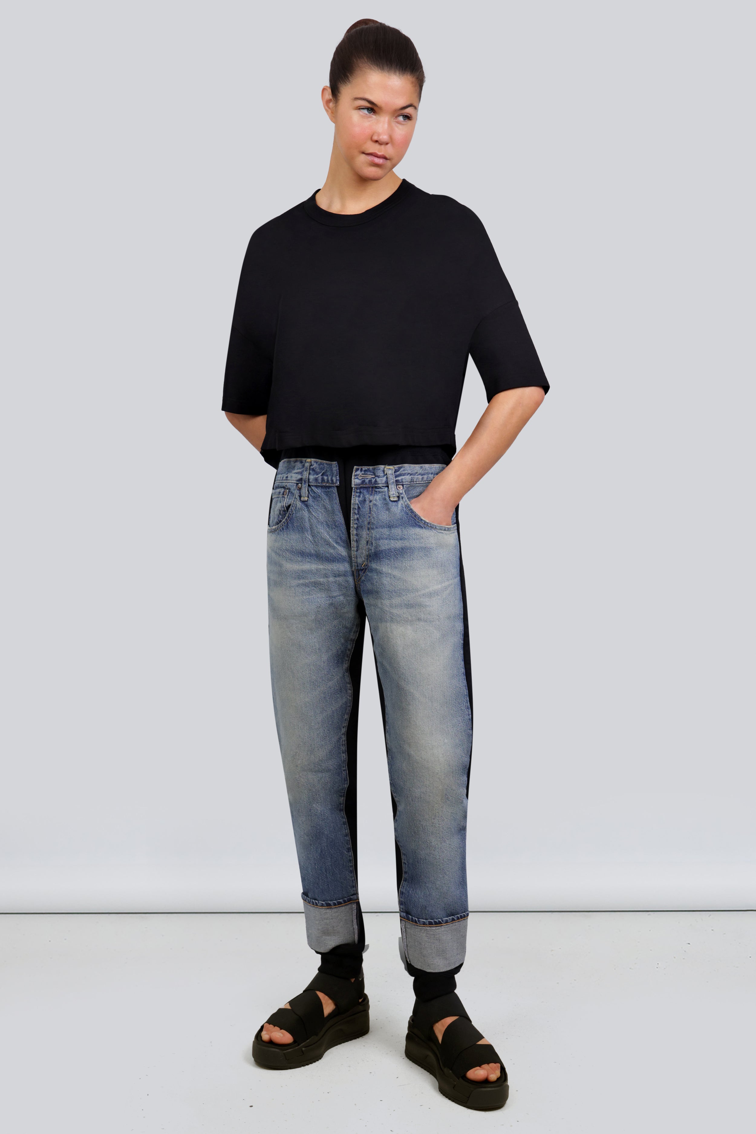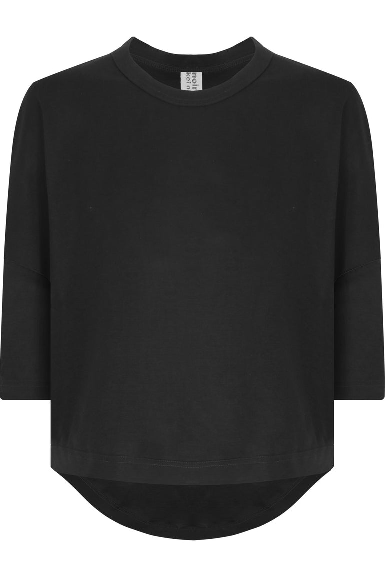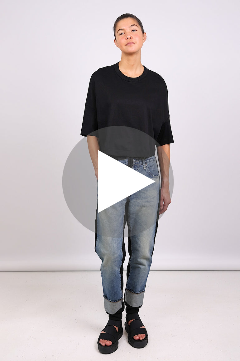 The Comme Des Garçons Noir Cropped T-shirt in black is crafted from cotton. The t-shirt features a boxy silhouette, drop shoulder short sleeves, a crew neck line and a longer back hem.