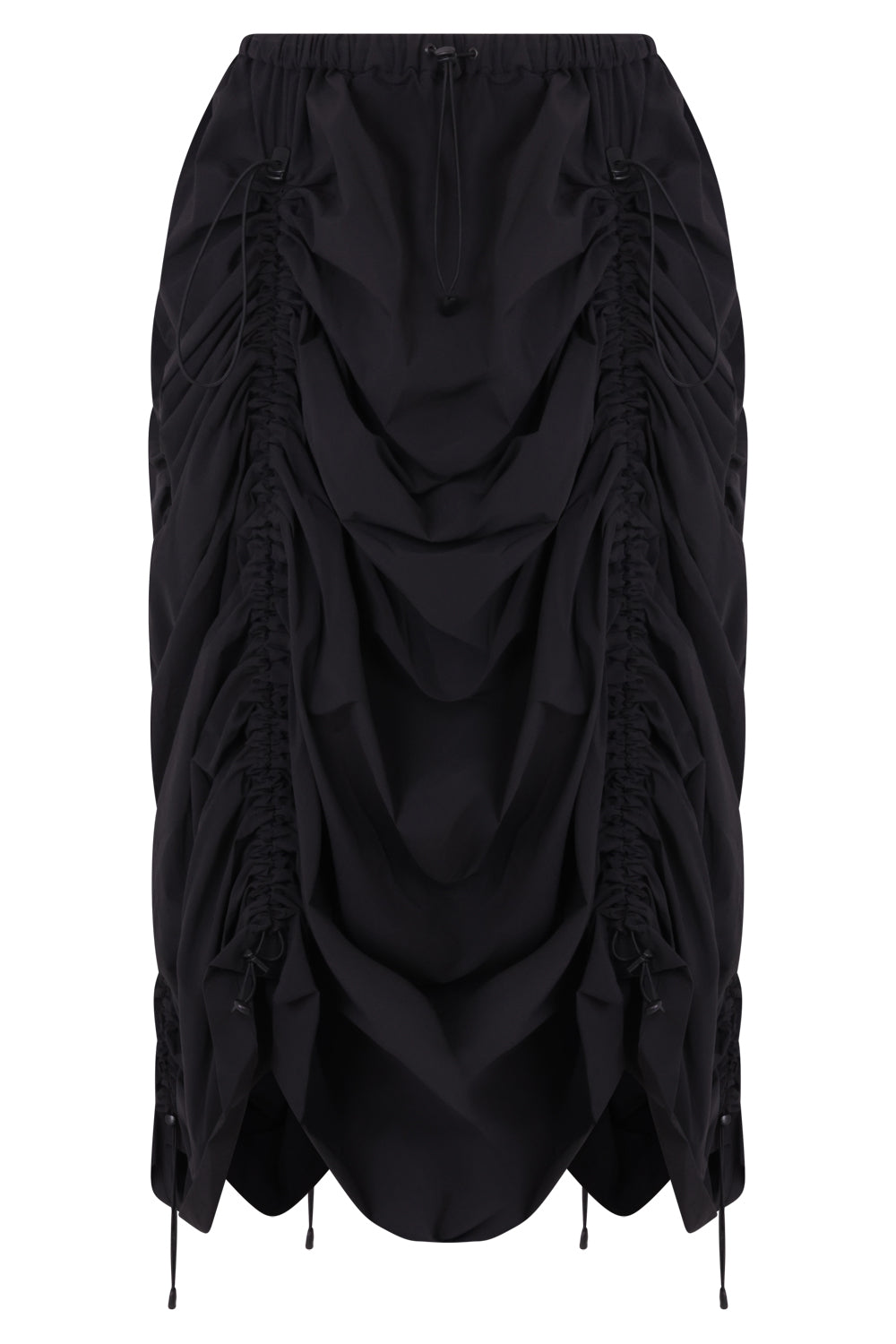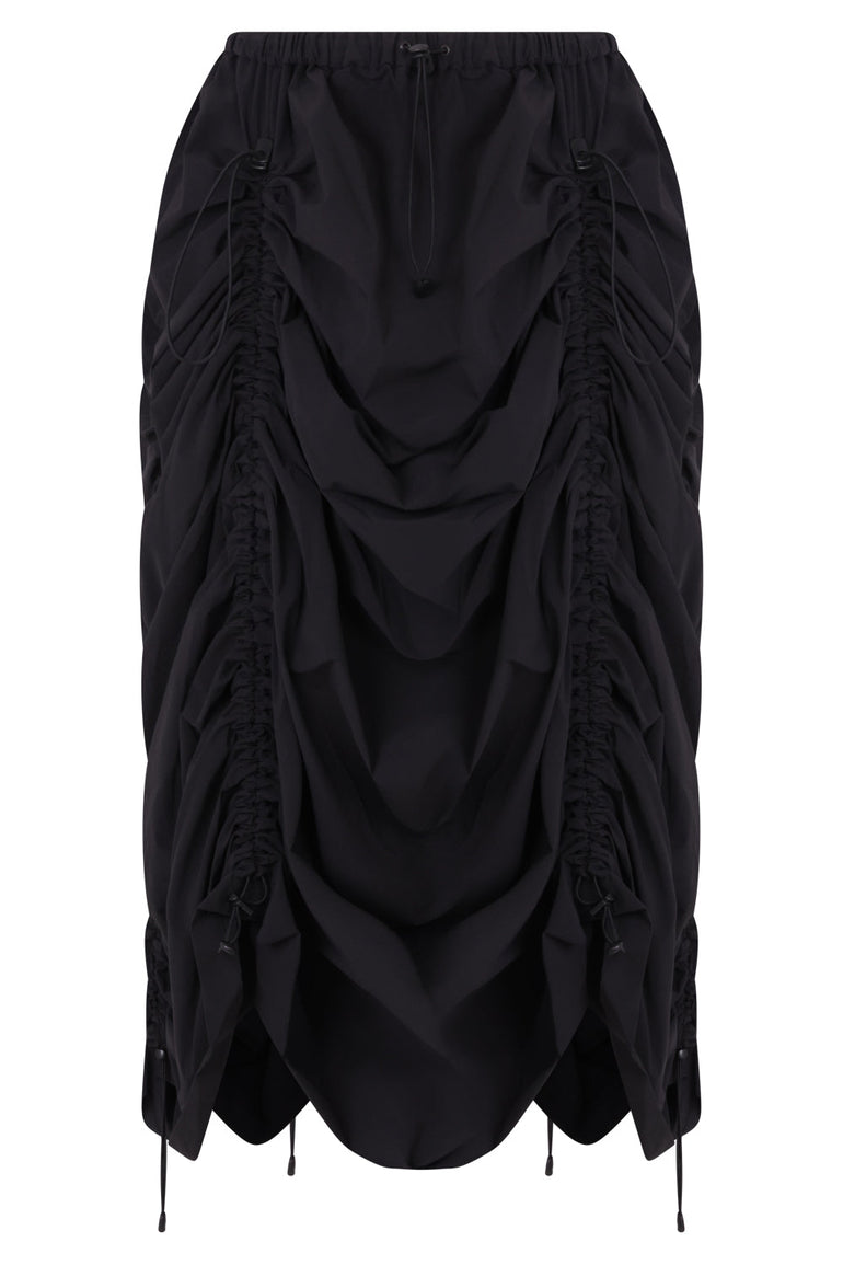 Nylon Polyurethane Stretched Skirt features ruched detailing with adjustable toggles and gathered hem are made of a nylon ripstop fabrication with an elastic waistband and symmetric lining.