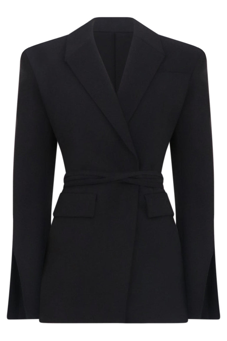 The Mugler Open Back Wool Jacket is crafted from viscose and is a blazer style silhouette. This style features an open back with long waist ties to cinch the waist, split cuffs with buttons, lapels and faux front pockets