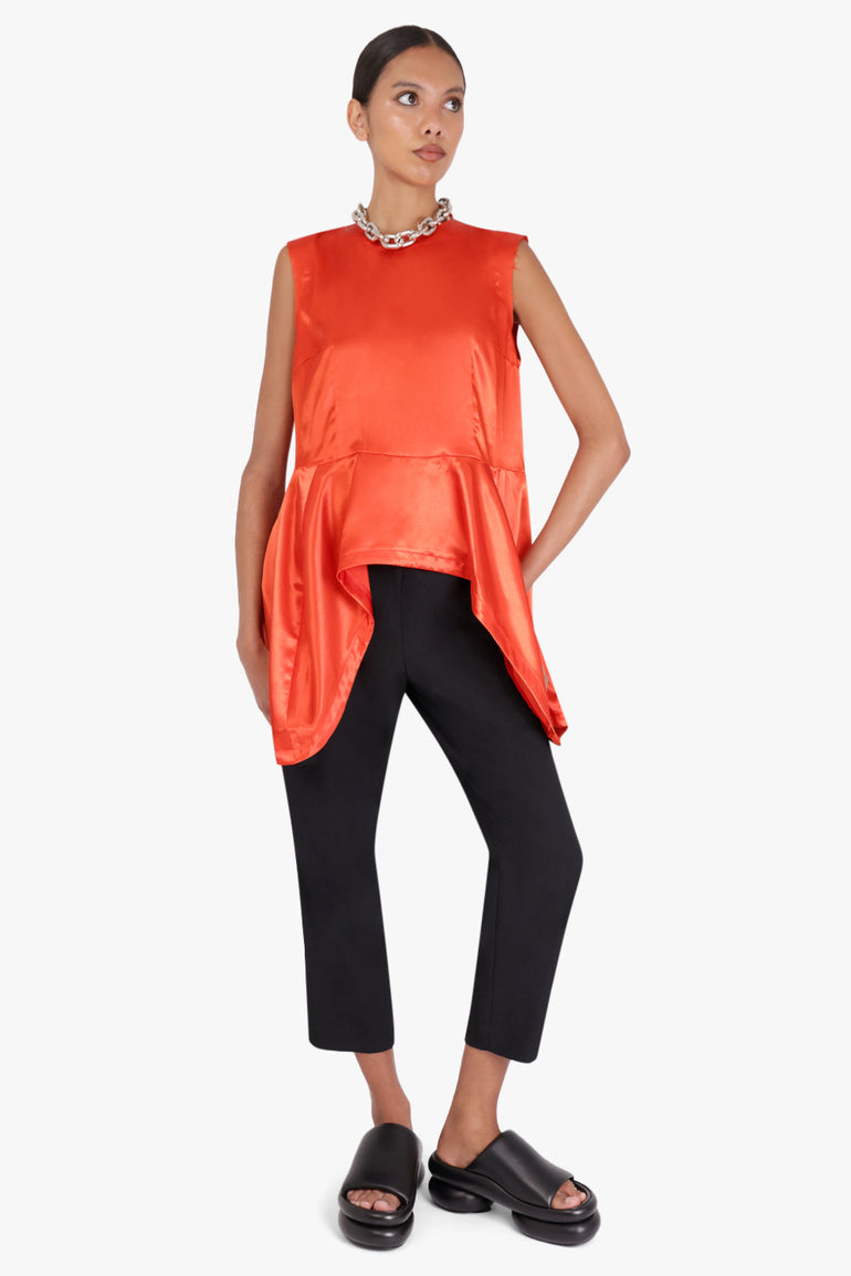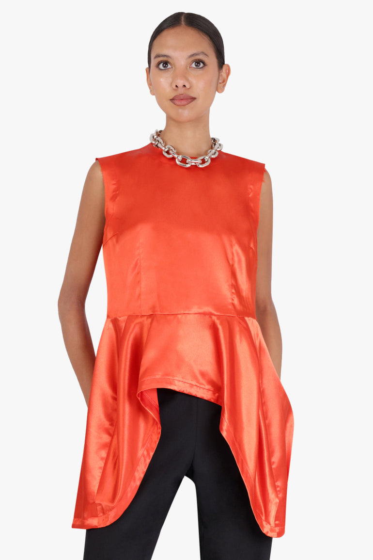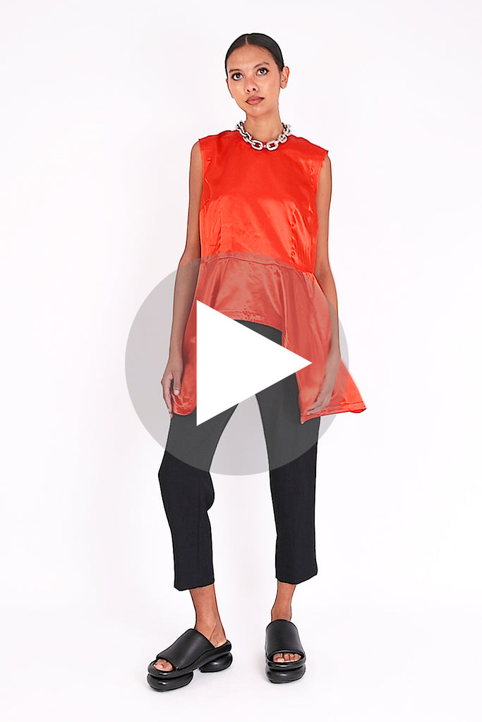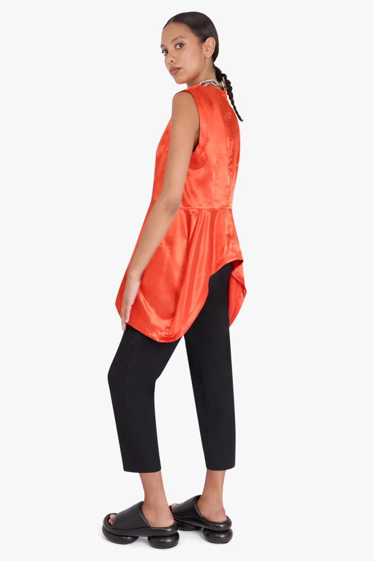 Inventors of defying silhouettes and reinvented techniques, challenging notions of beauty and aesthetics, Comme des Garçons recategorised what is called luxury fashion, as seen in this Red Polyester Satin Top.