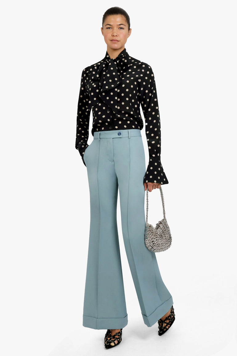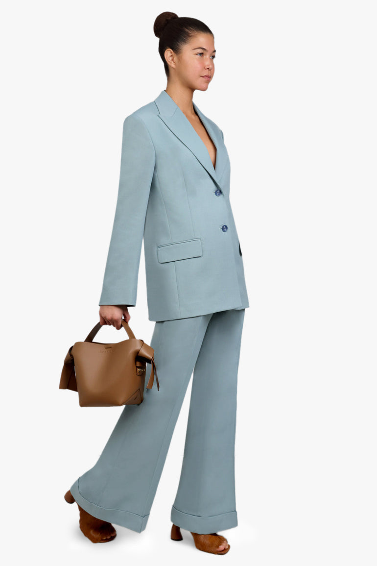 Acne Studios aqua blue tailored trousers are crafted from a wool blend, detailed with front topstitched leg pleats and fold-up hem. Complete with side pockets and back welt pockets. Cut to a regular fit with a mid-waist, flared leg and long length.