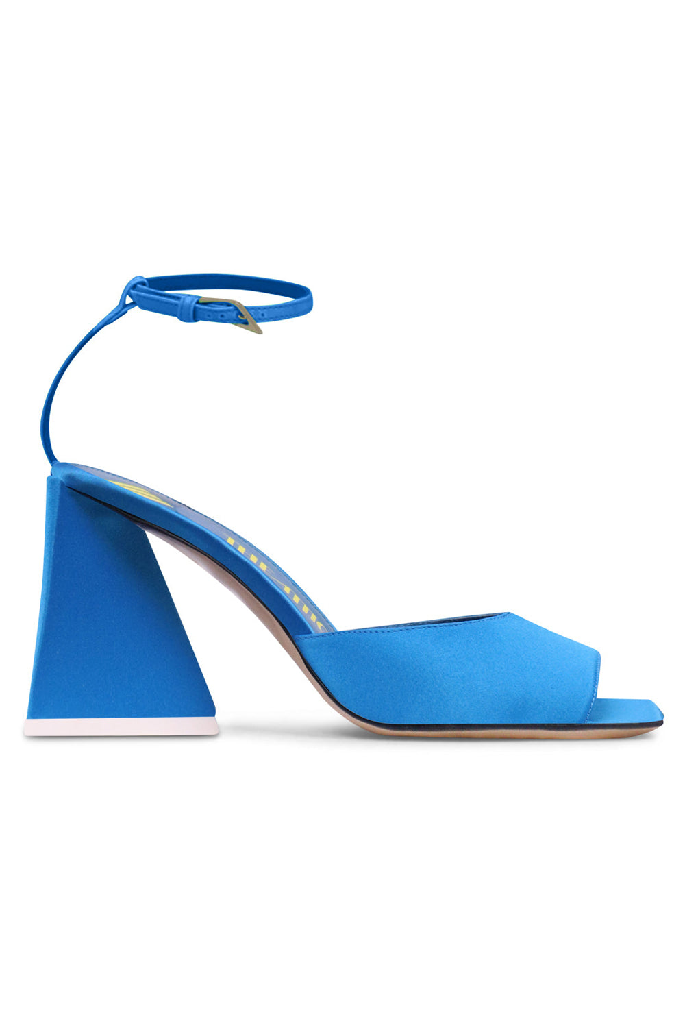 The Attico Piper 85mm Patent Sandal is crafted from a dyed satin. This style features an open square toe, buckle fastening ankle strap, pyramid heel and goat leather insole with printed logo.