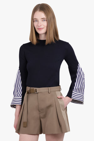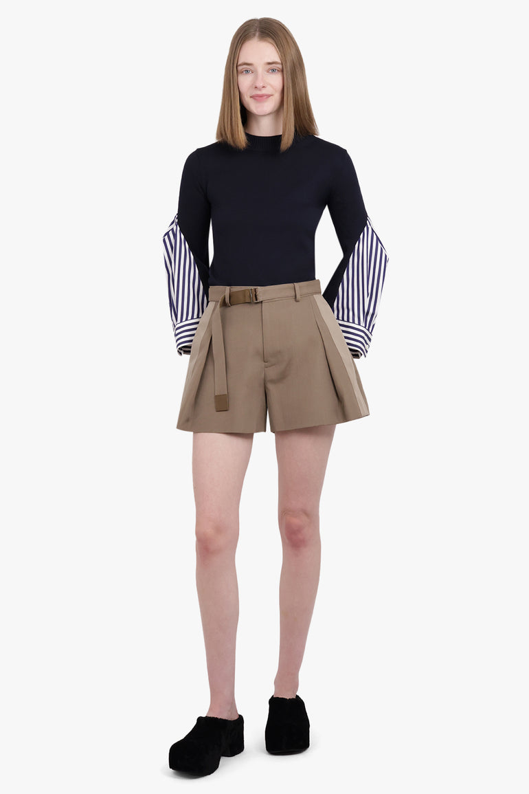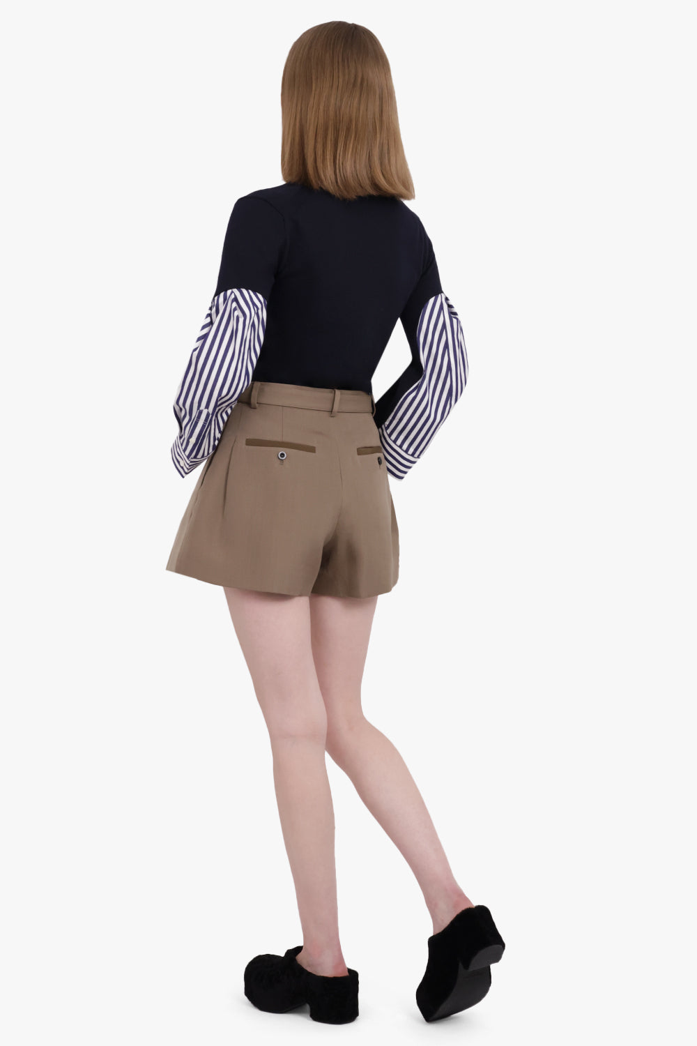Featuring a slight flare style, this short boasts front and back pleat detailing, contrast side stripe, and convenient side seam pockets. The ribbon-tie waistband, center front zip fly, and double back button pockets add functionality to this fully lined piece.