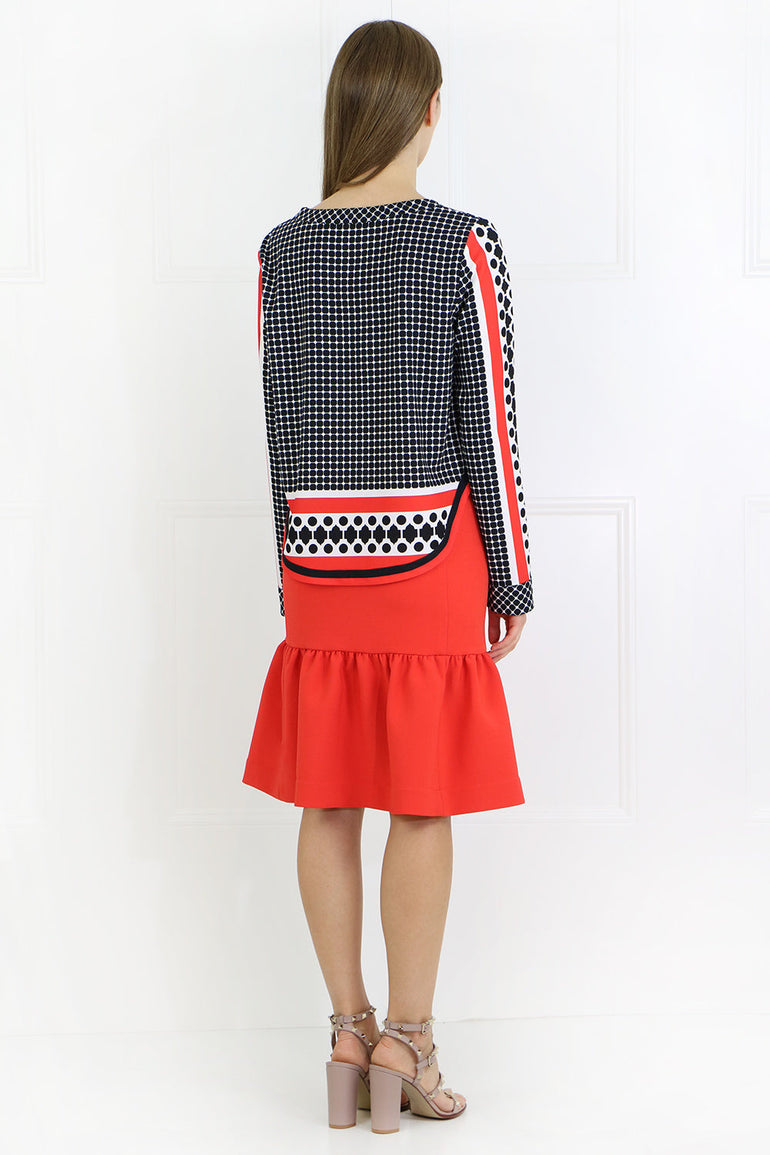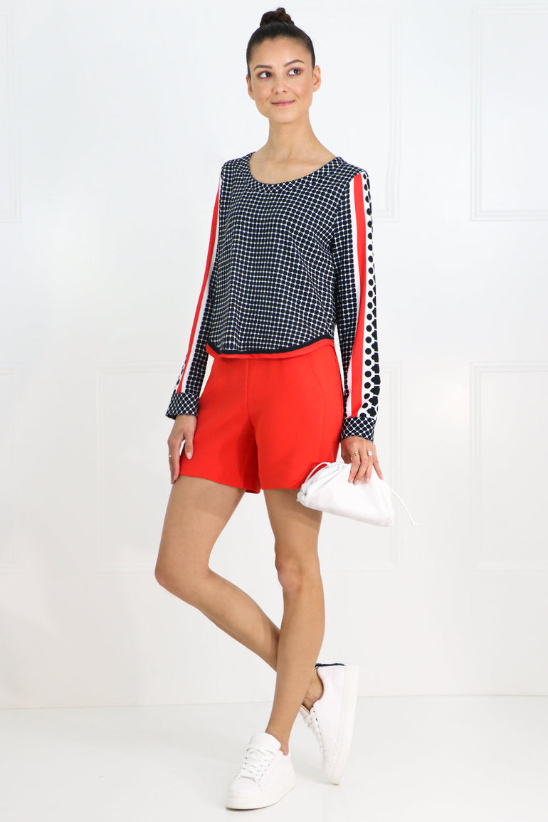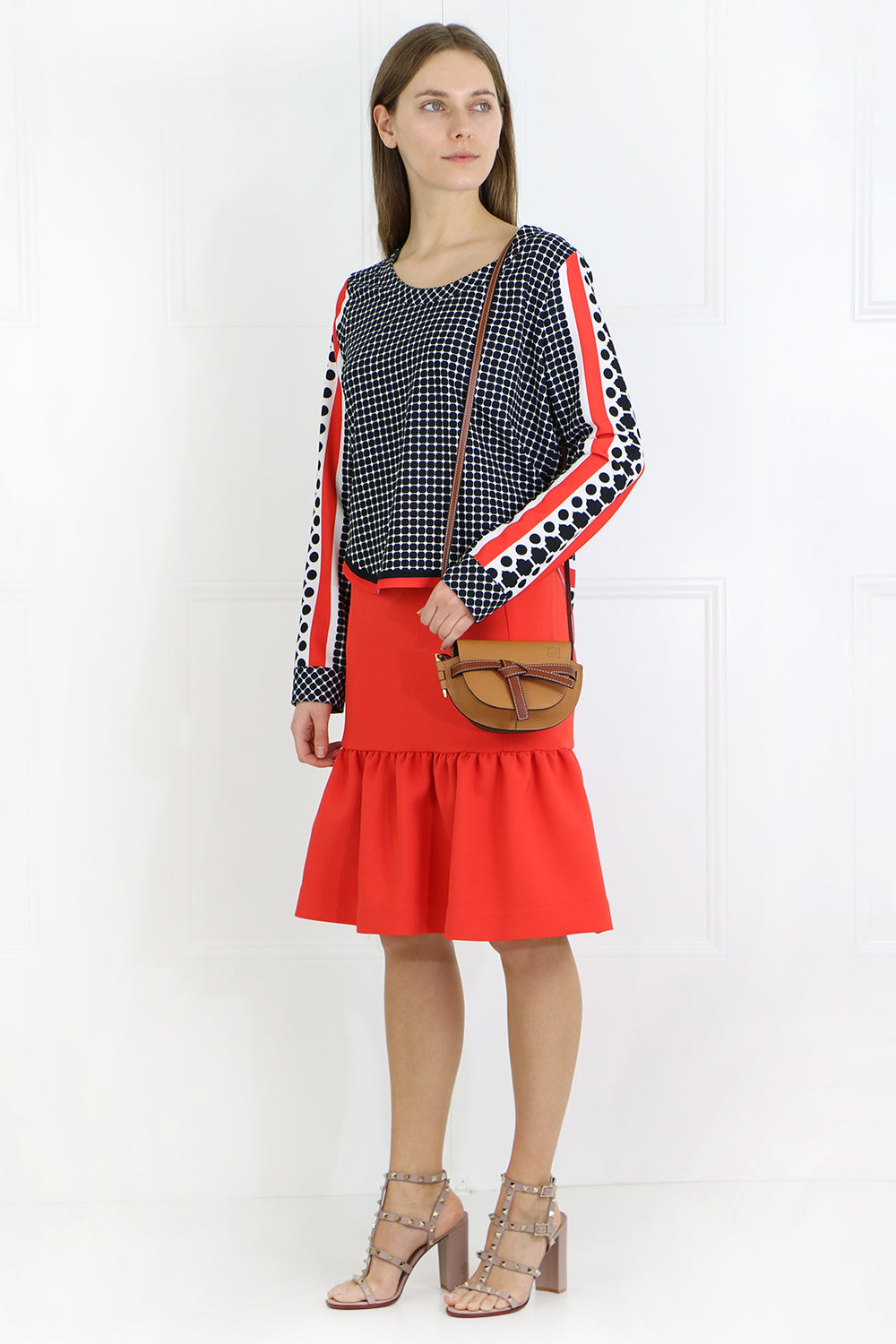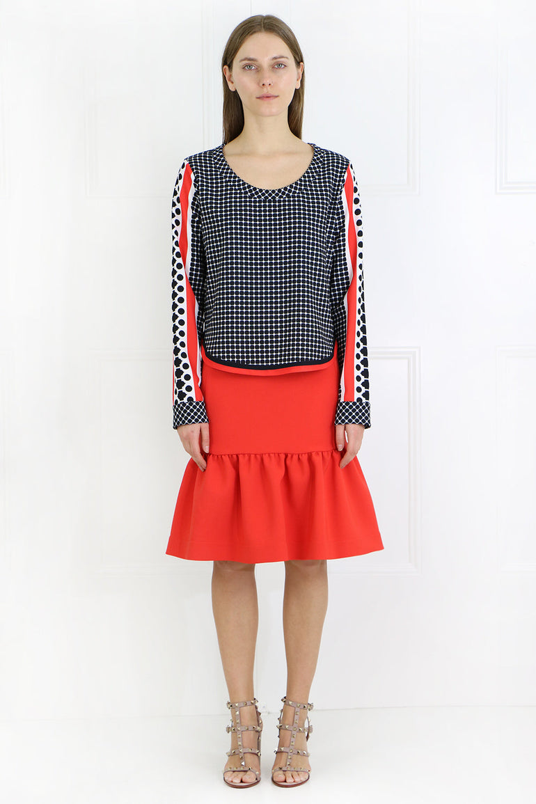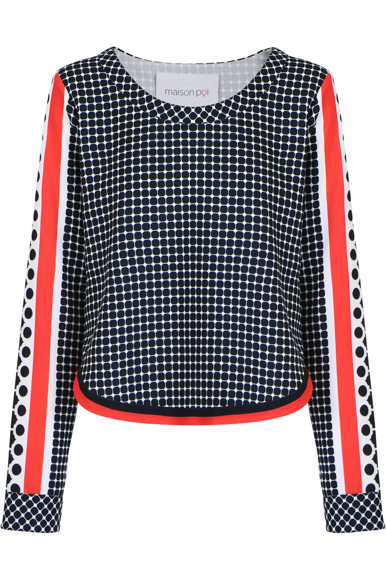 The Maison Poi E Top features long sleeves and a round neck. It is cut in a loose silhouette with a longer hemline at the back. It is decorated with the Quatre Saison print.