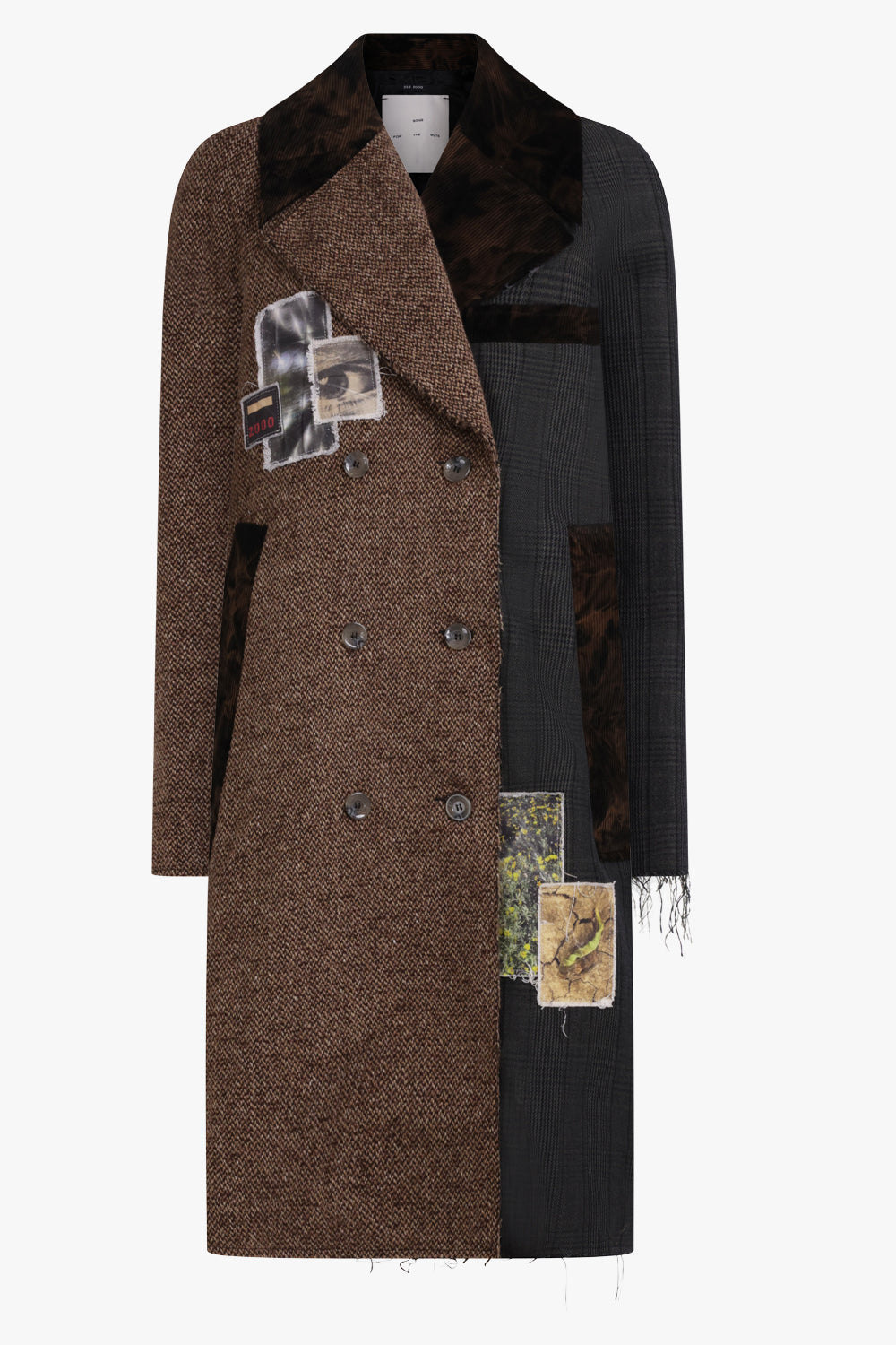 Fully lined overcoat in a coarse wool gabardine with semi-raglan shoulders. Featuring a notch lapel collar with fringed cotton patches on the front.