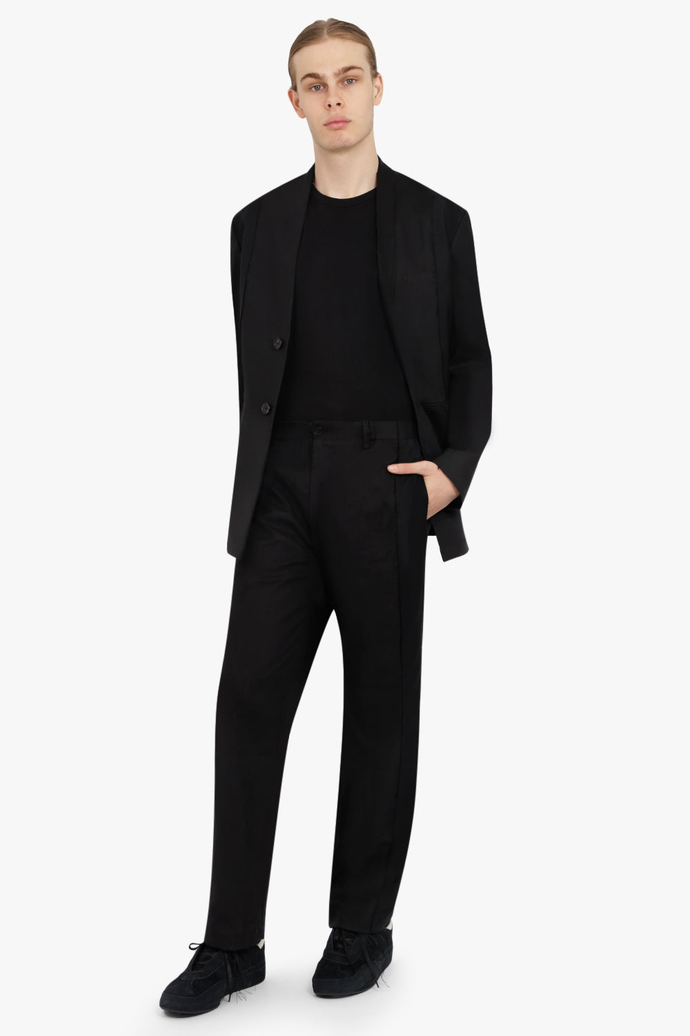 This blazer is deconstructed and features a single-breasted design with a two-button closure. It is fully lined and has a standing collar, making it a stylish and practical option.