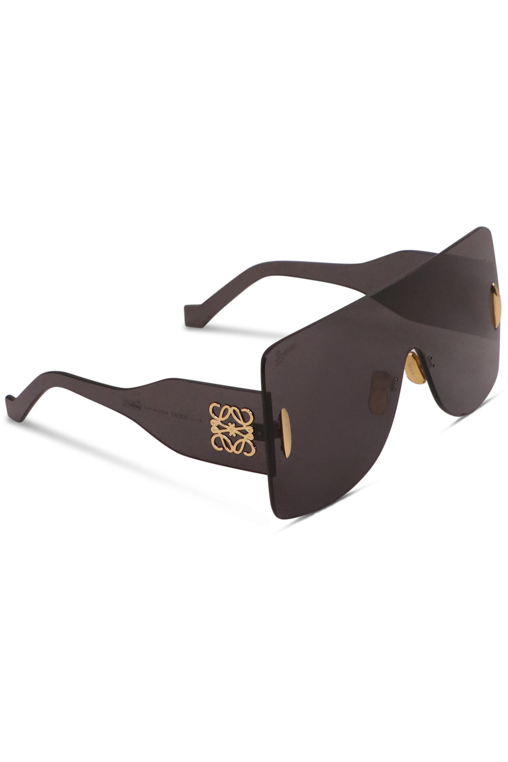 The Loewe Rectangle Mask Sunglasses are crafted from acetate and are an oversized, mask style with wide lenses and the logo in gold on the temples.