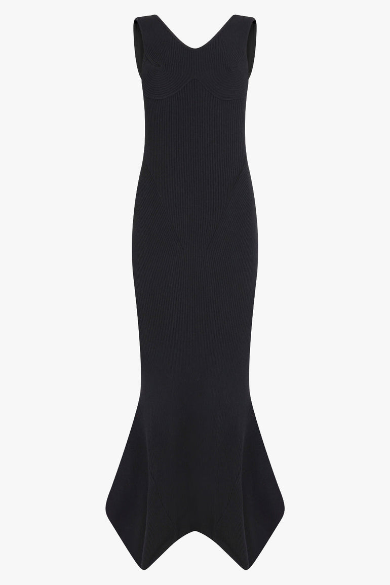 The rib-knit flared dress showcases a fitted silhouette that gracefully accentuates your body. It features a delicate Moon logo detail in pointelle stitching at the back. The traveling knit construction highlights the intricate stitch work.