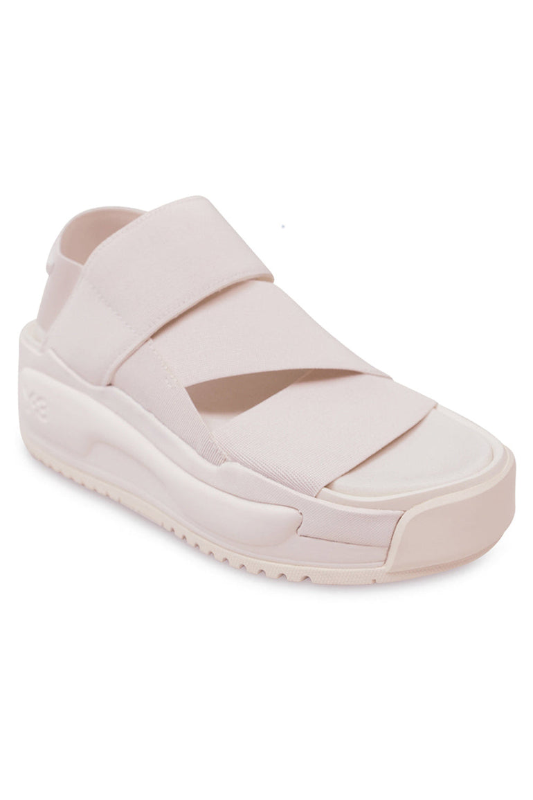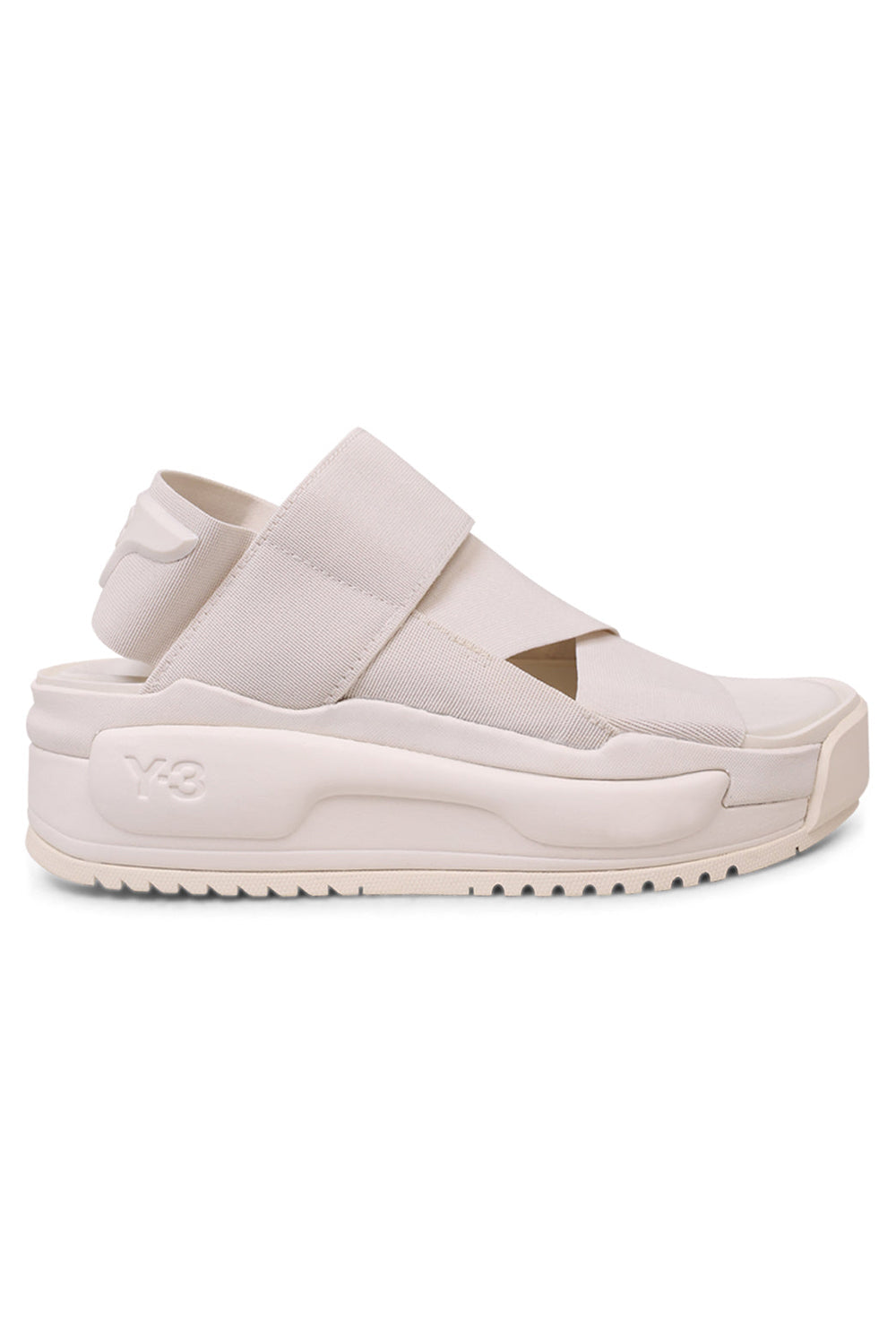 The Y-3 Rivalry Sandal in White is an open toe slide in sandal featuring a heavy duty webbing strap with platform rubber sole.