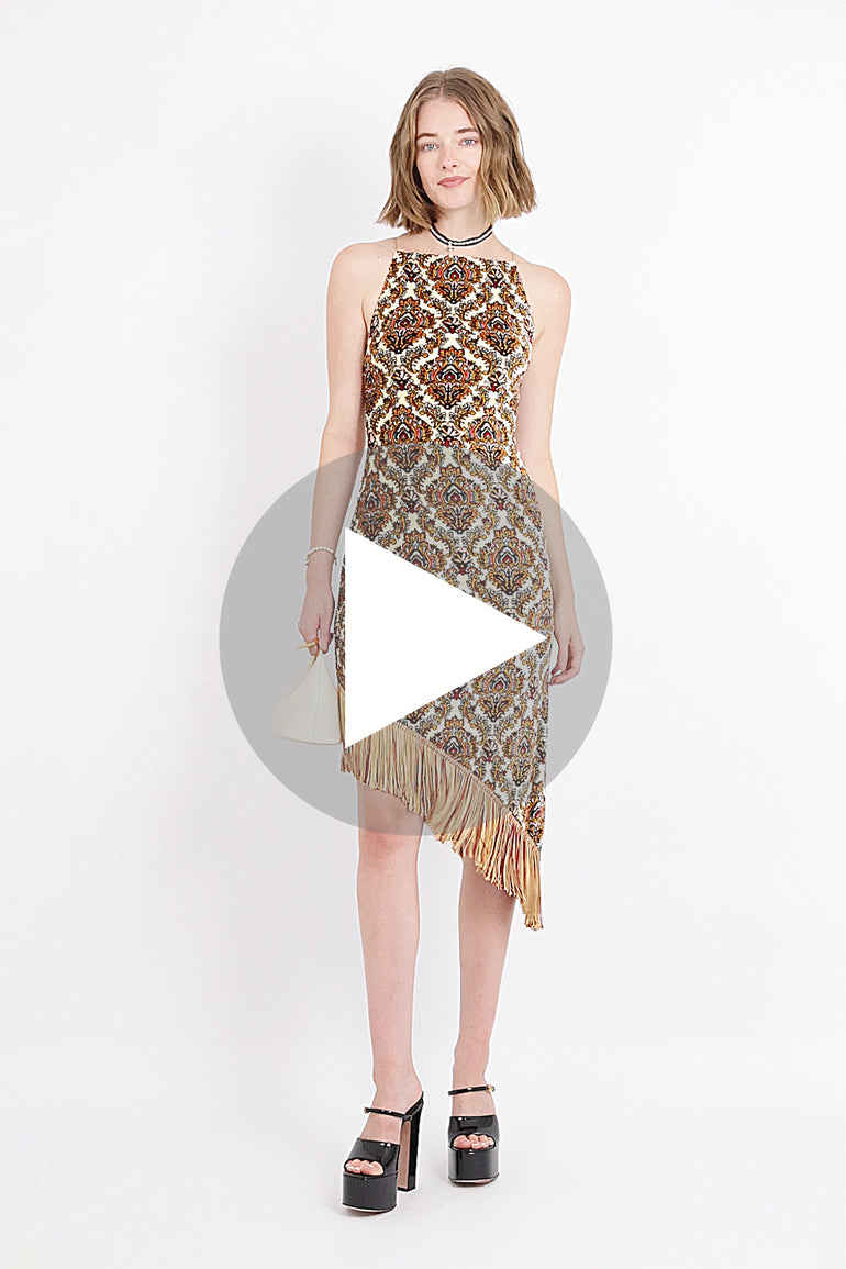 At once sculptural and seductive, Paco Rabanne’s eponymous clothing line experiments with looks made from molded plastics, hammered metal, aluminum jersey and knitted fur. This soft velvet like fabric features a fringe helm and cross over open back