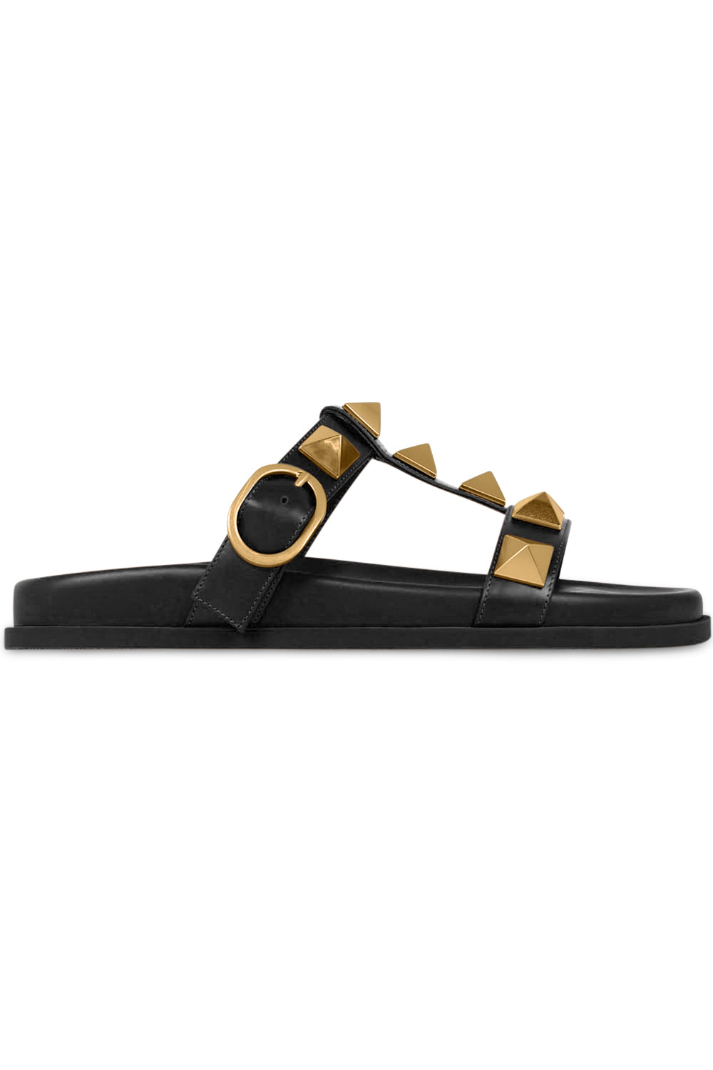 The Valentino Roman Stud Slides in Black is crafted from a leather fabrication and features a signature gold-tone stud detailing. This slip-on style features an open toe, side buckle fastening, and a branded insole.