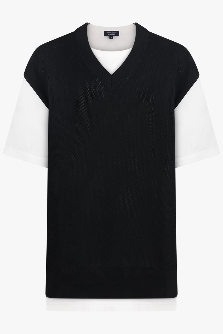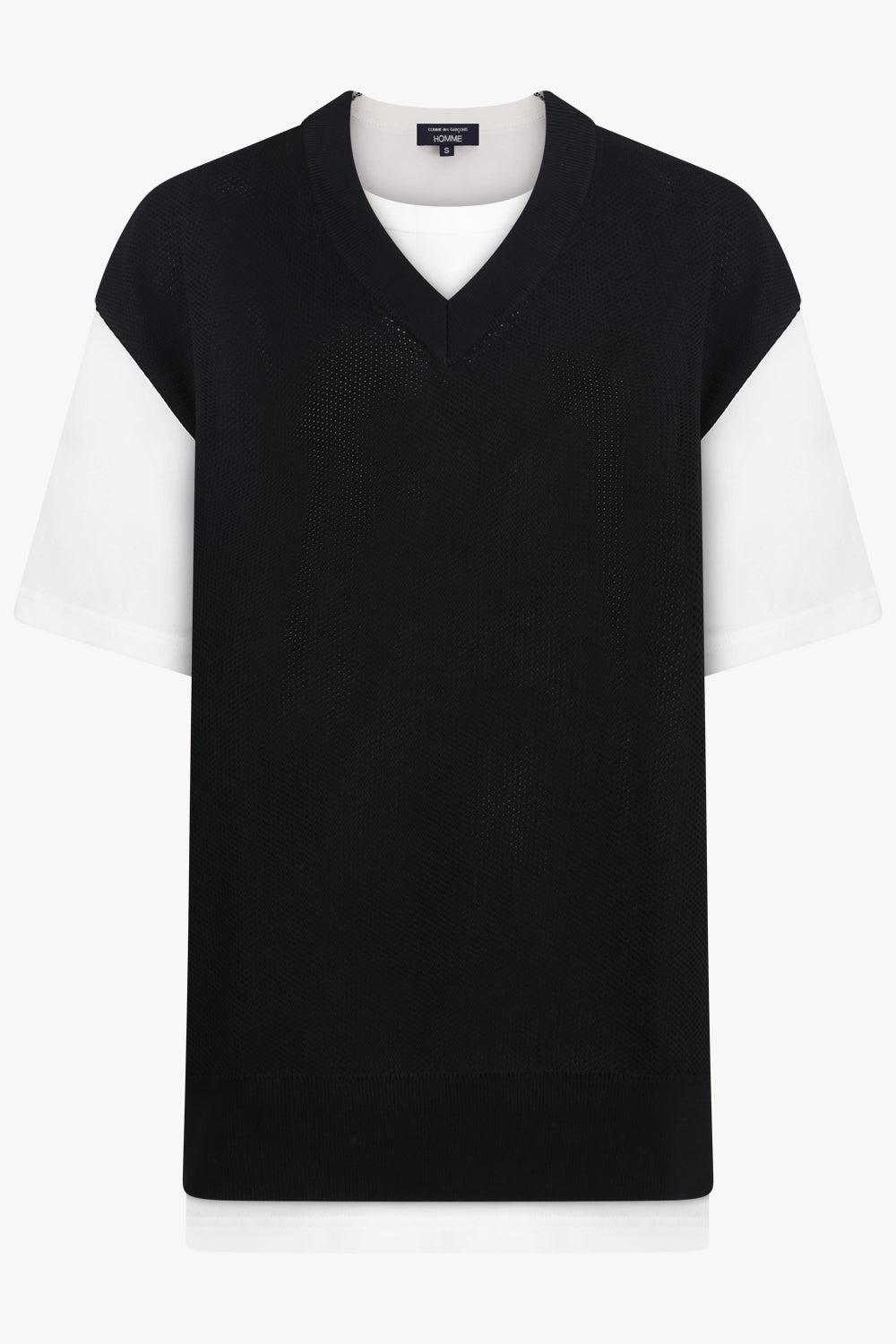 A reimagined staple with layered dimension, this short-sleeved T-shirt combines a crisp cotton jersey base with a contrasting polyester knit vest overlay. The integrated design creates the illusion of two garments, offering a directional take on everyday dressing with subtle contrast and structure.