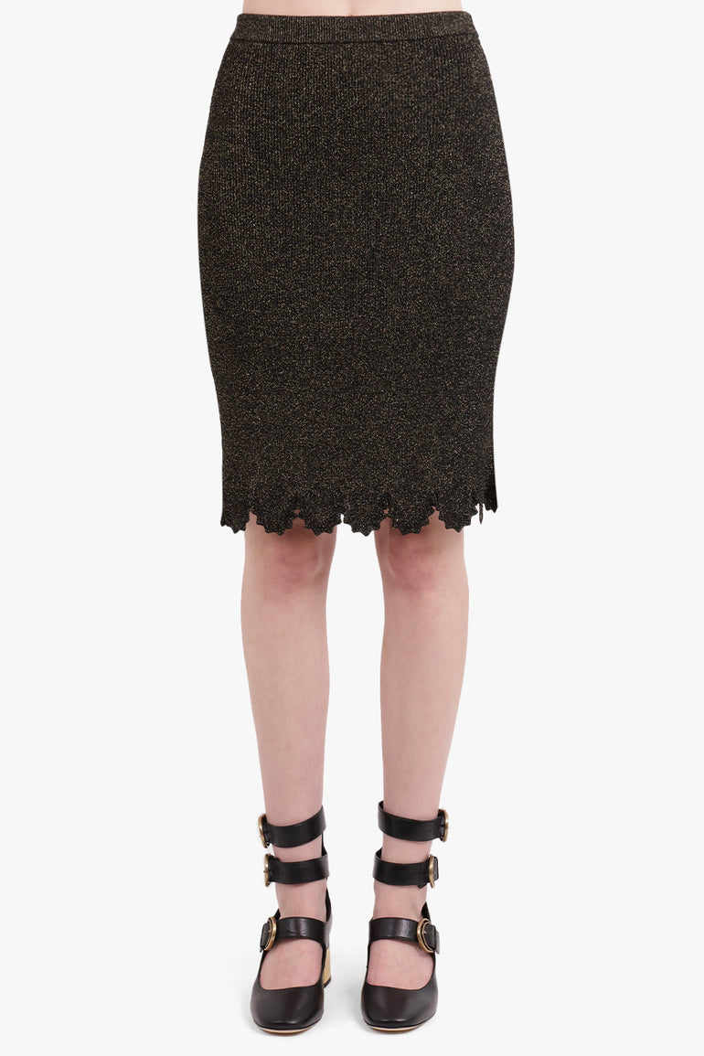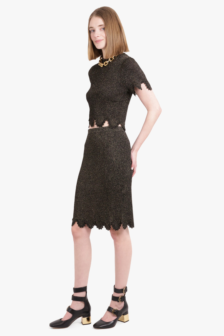 The Chloe Scalloped Lurex Midi Skirt is crafted in a viscose lurex. The style features a scalloped hemline and simple waistband detail and is designed to be a straight style skirt.