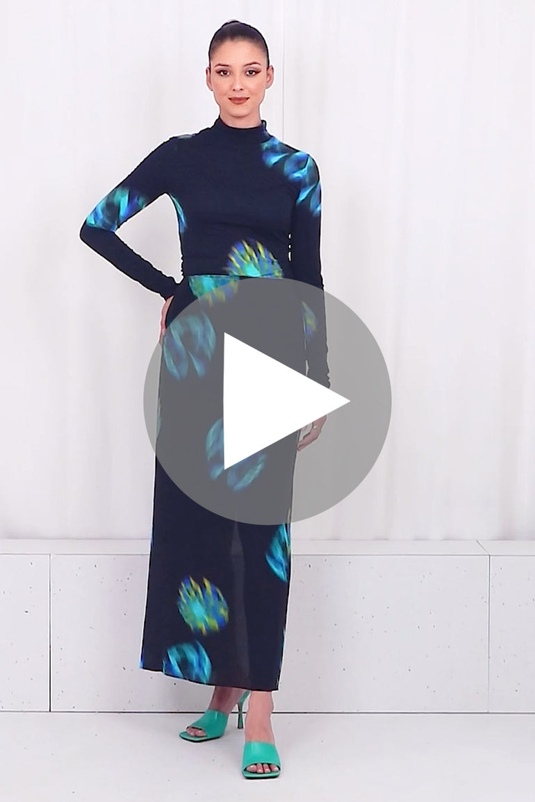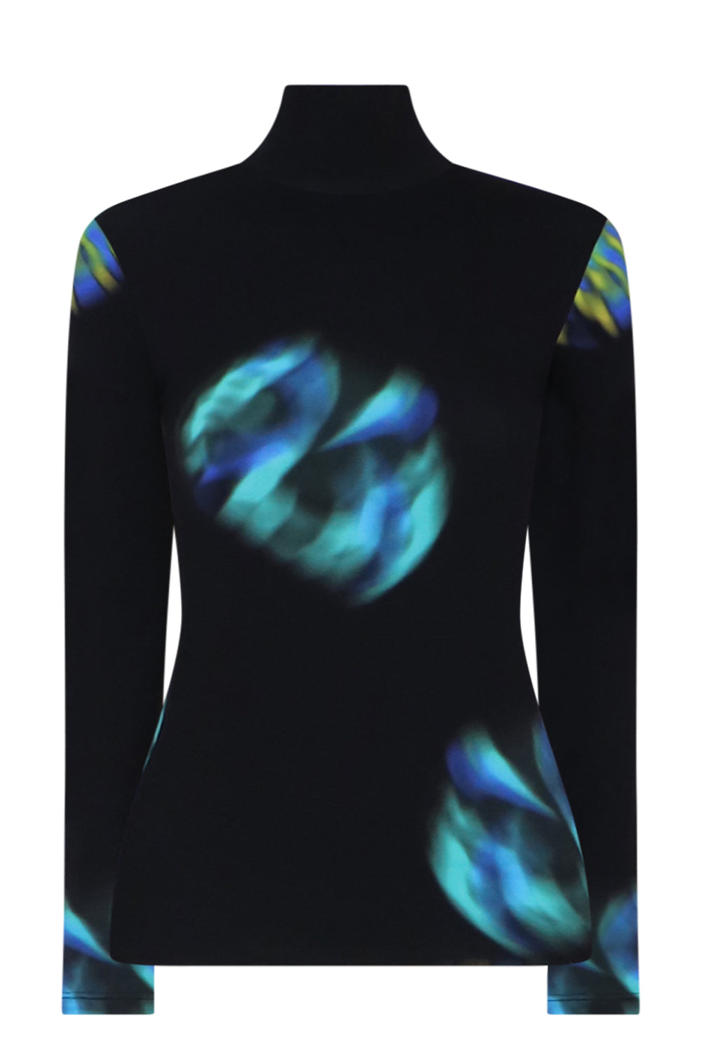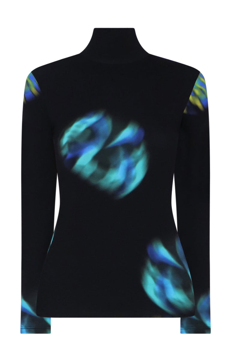 The Nina Ricci Second Skin L/S Shirt is crafted from a stretchy polyamide that features a contemporary aqua and black print. This style includes a turtleneck and elongated sleeves.