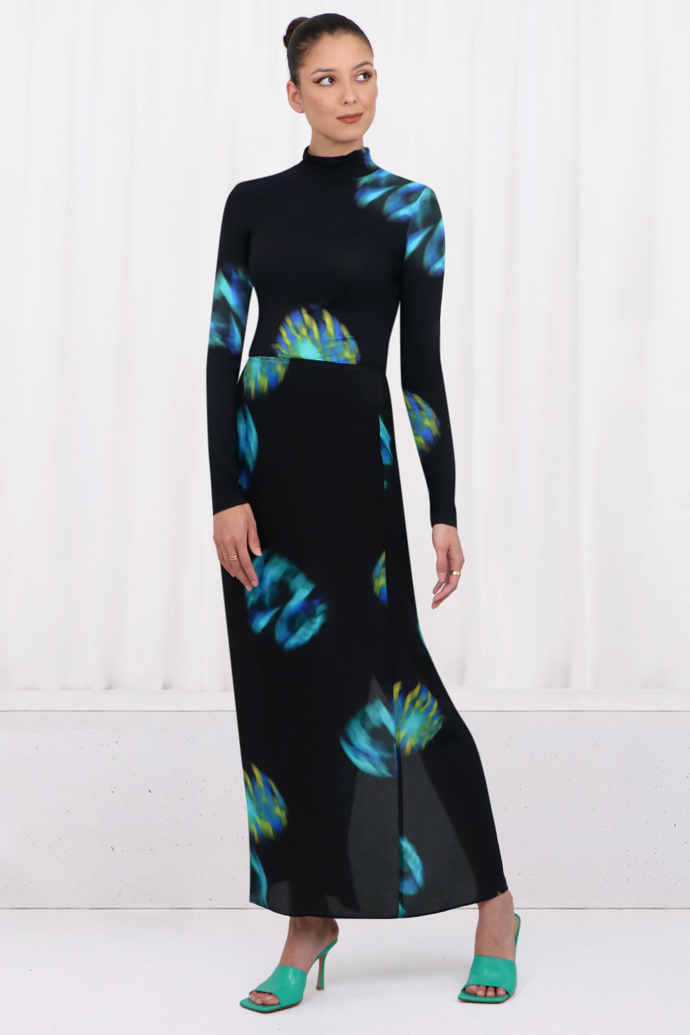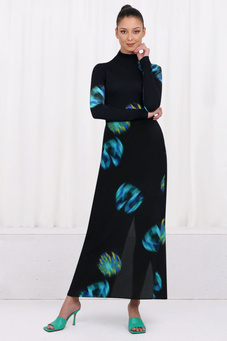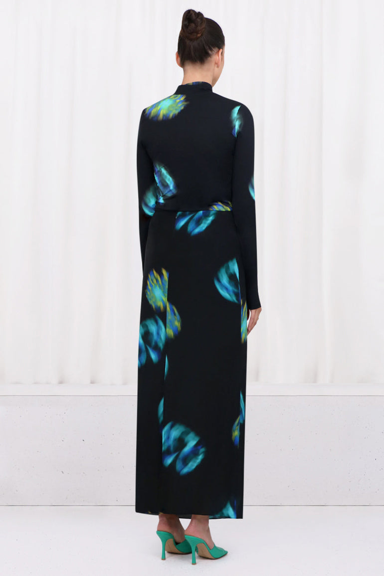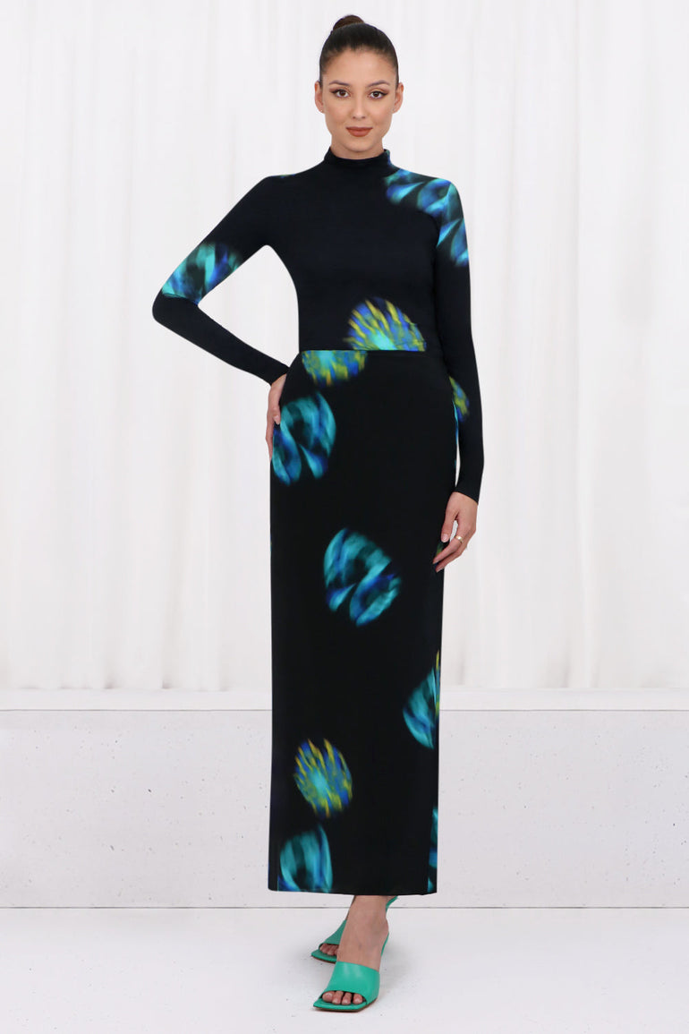 The Nina Ricci Second Skin L/S Shirt is crafted from a stretchy polyamide that features a contemporary aqua and black print. This style includes a turtleneck and elongated sleeves.