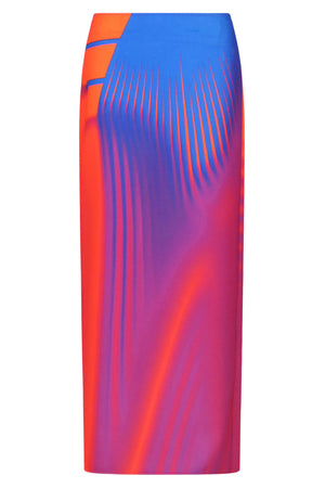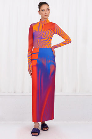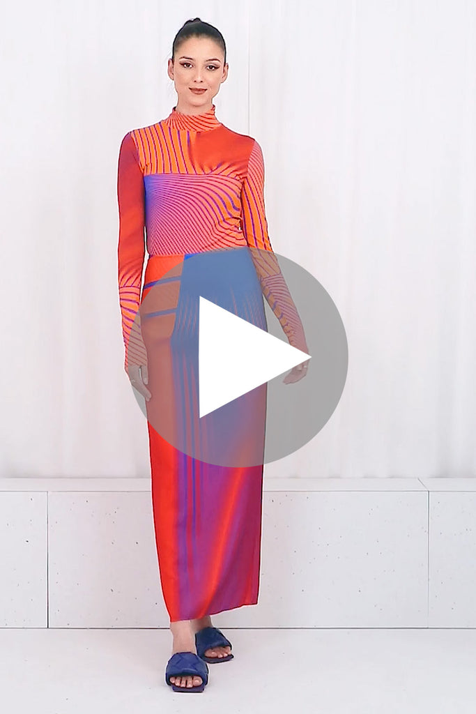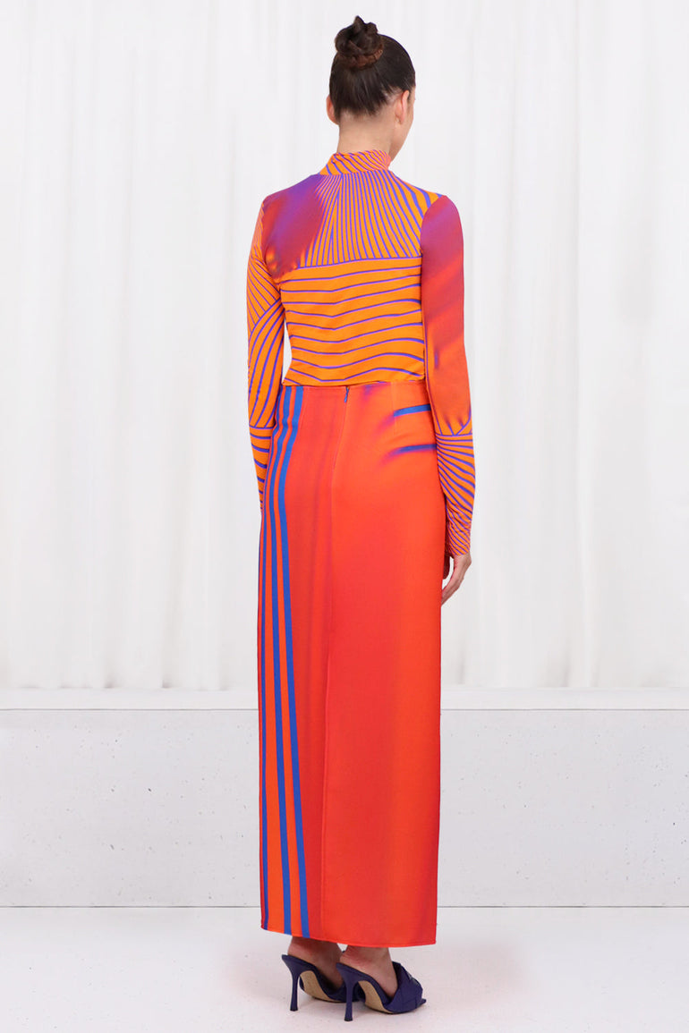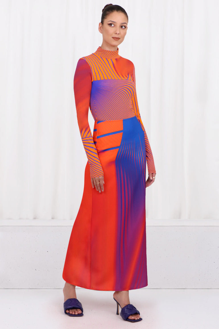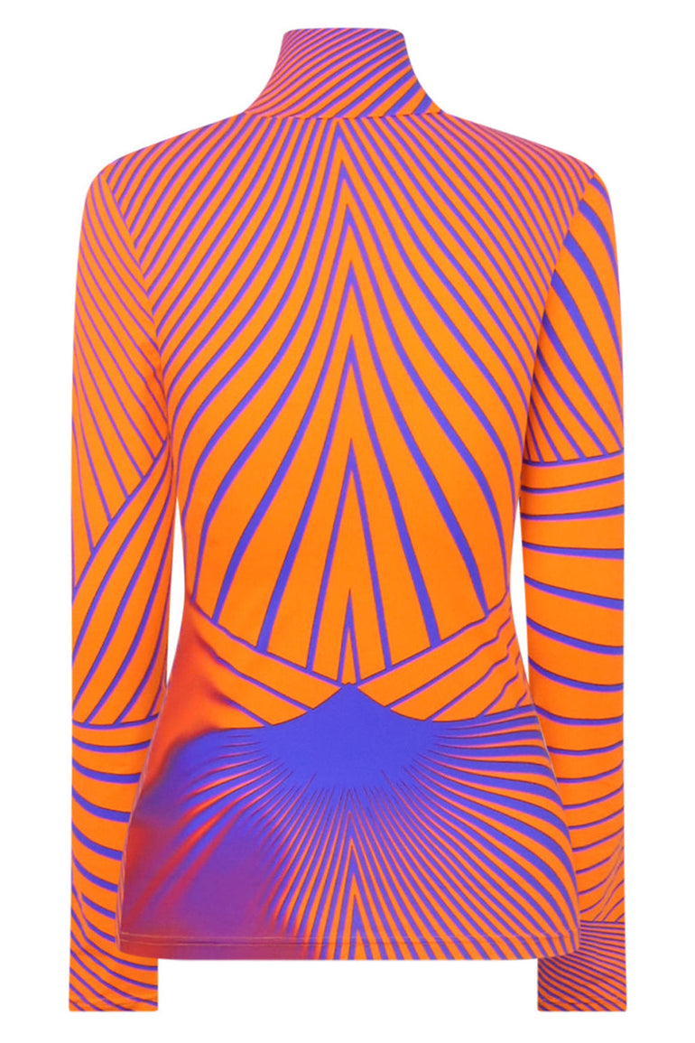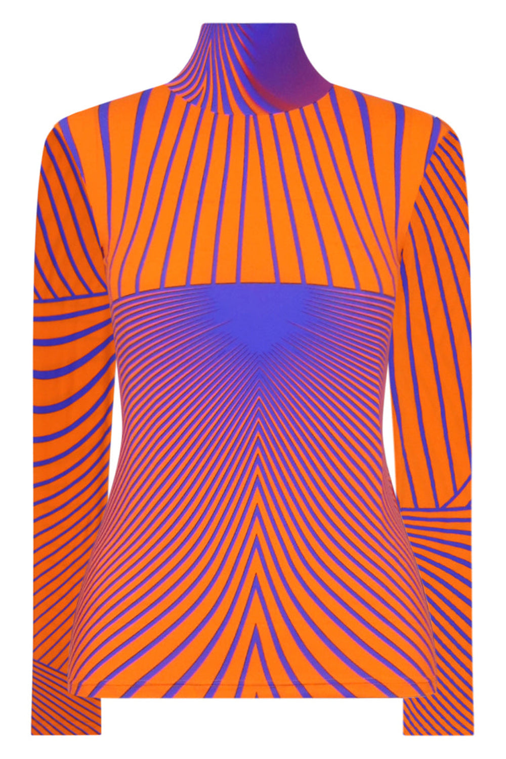 The Nina Ricci Second Skin L/S Shirt is crafted from a stretchy polyamide that features a graphic orange and purple line print. This style includes a turtleneck and elongated sleeves.