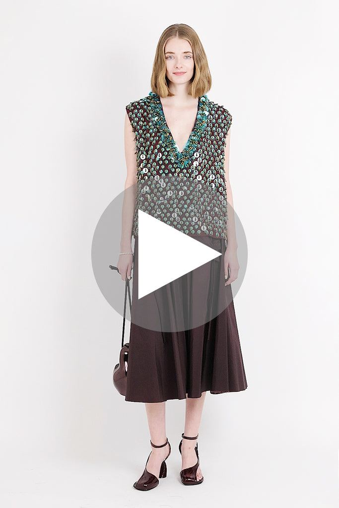 Crafted from lightweight Indian viscose with a weight of 160 grams, this V-neck vest features short sleeves and is adorned with elegant sequins and gems for added texture.