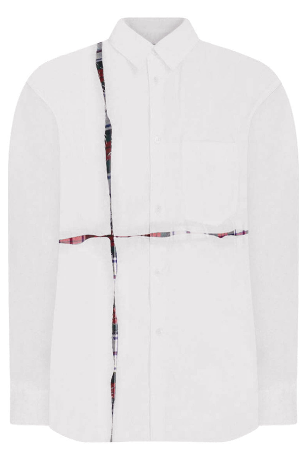 The Comme Des Garçon Shirt with Tartan Detailing is crafted from cotton and is a straight fit, featuring a chest pocket, a pointed collar, cuffed sleeves, and tartan detailing across the front.