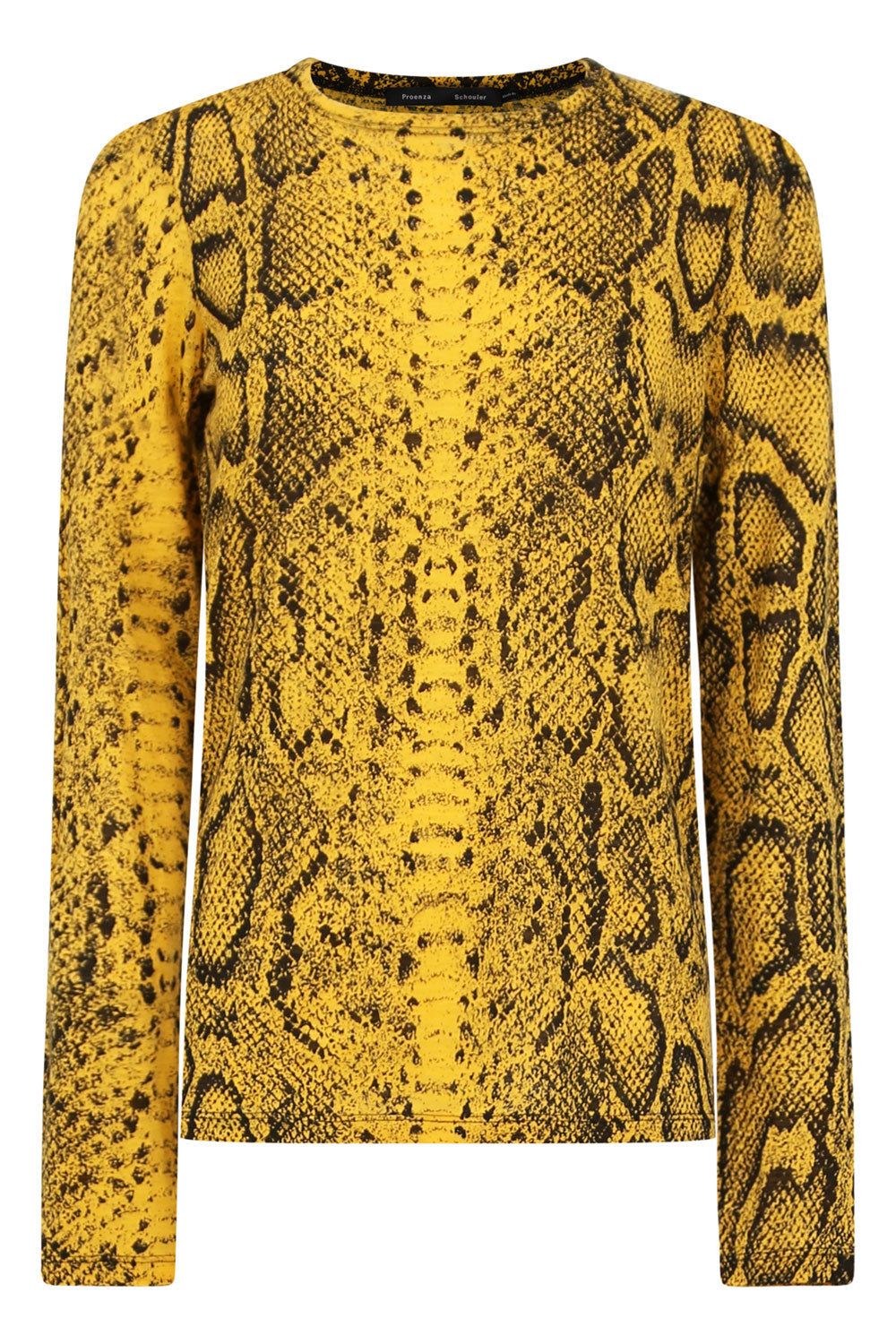 The Proenza Schouler Snakeprint L/S T-shirt in yellow is crafted from an all-over snakeskin print fabric and features a round neck, long sleeves and a straight hem.