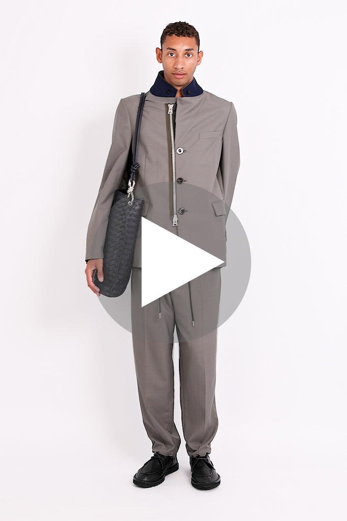 The Sacai Suiting Jacket in Taupe is a plain-woven polyester and wool-blend and nylon taffeta blazer. This style features an asymmetric, layered, and panelled construction; including rib knit band collar, hem, and cuffs, throat guard at convertible notched lapel.