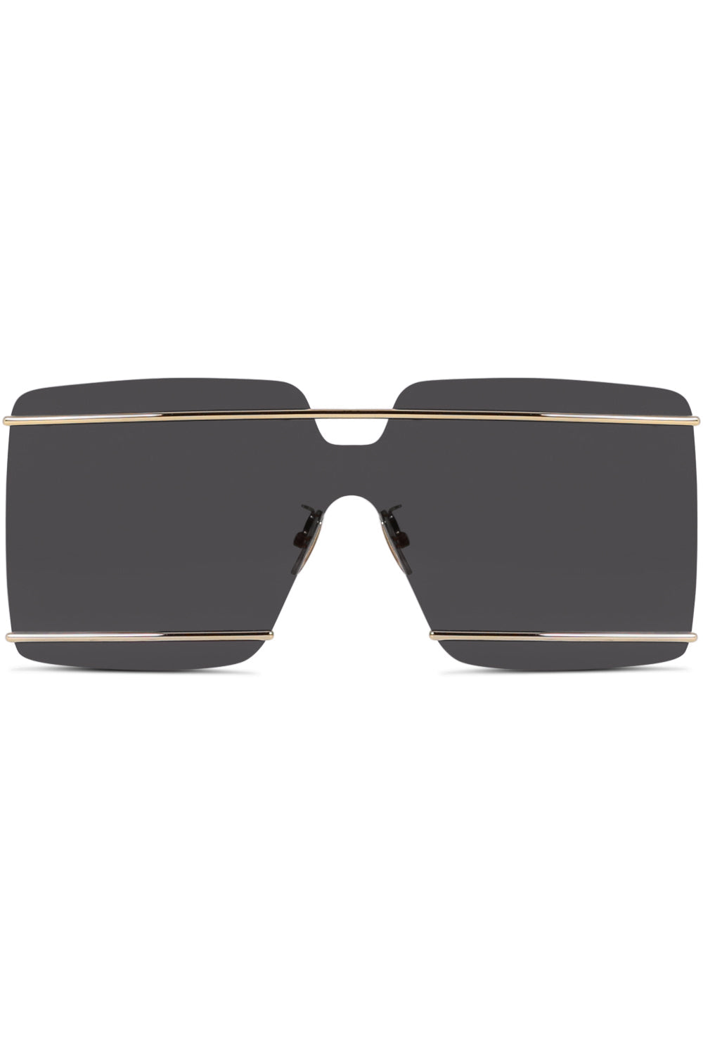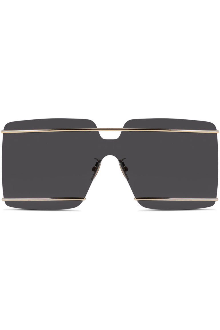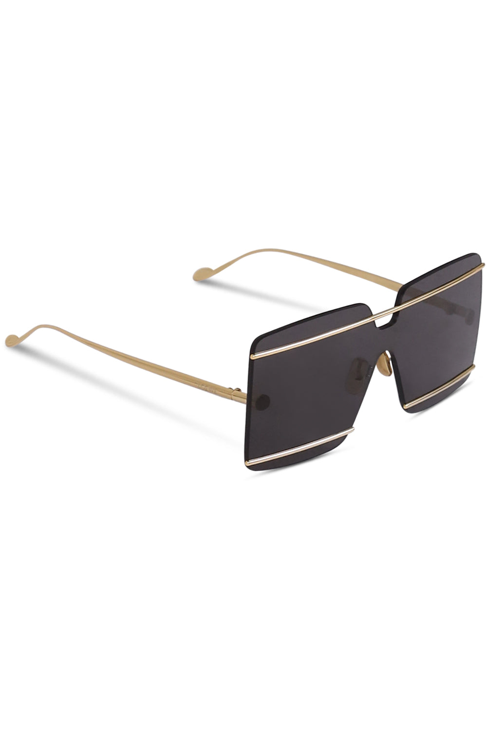 The Loewe 213 Metal Square Sunglasses in Gold/Smoke are crafted from metal. This style features grey lenses and gold metal detailing across the top and bottom of the lenses.