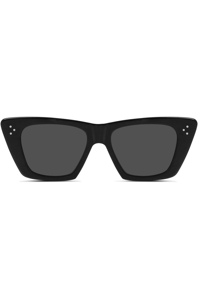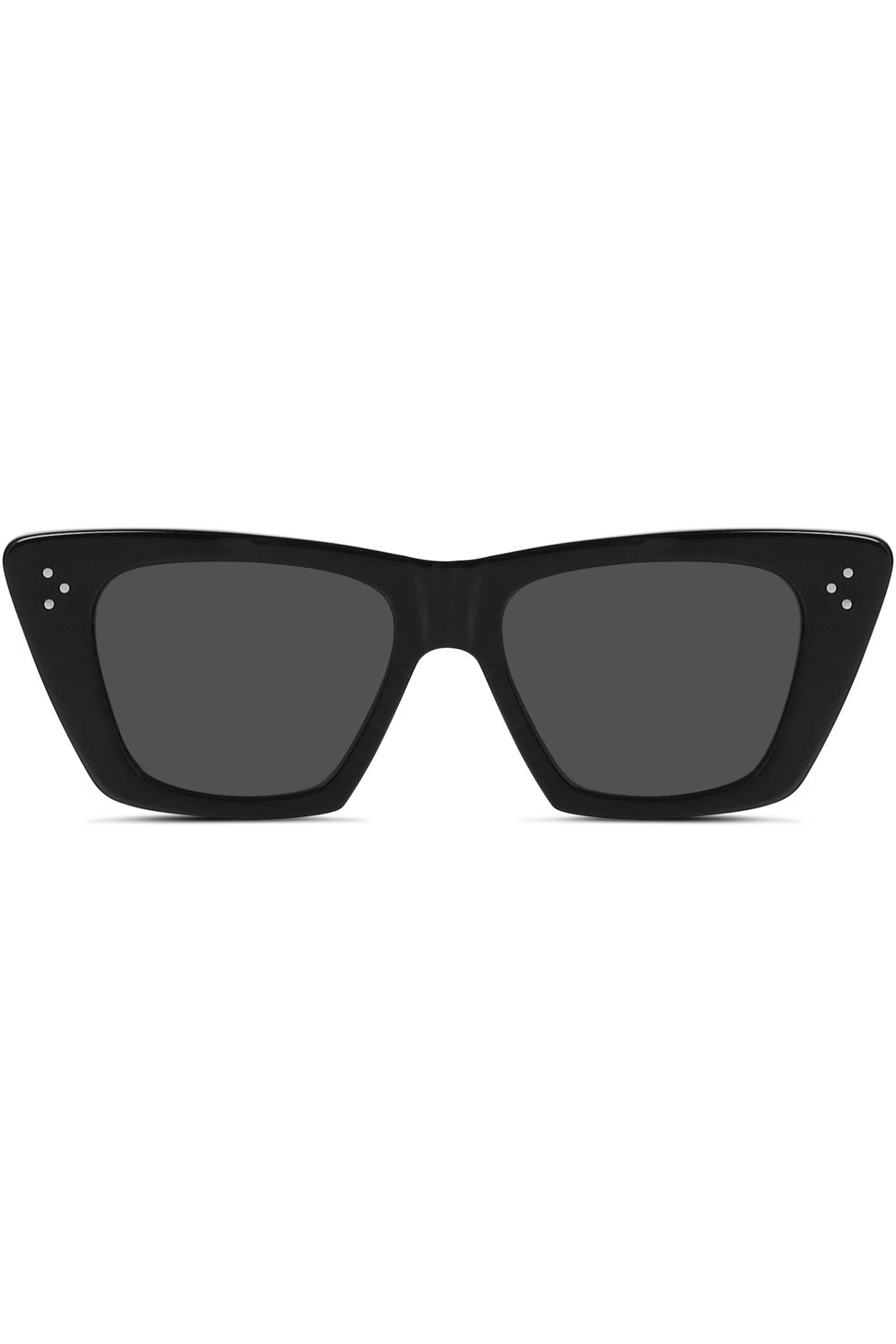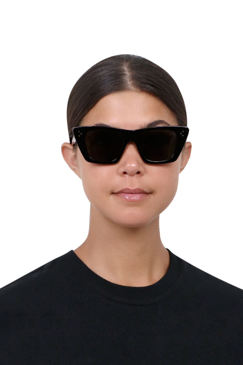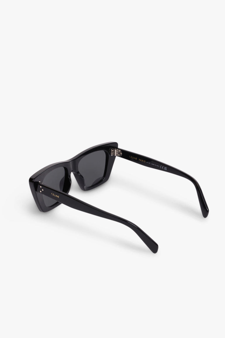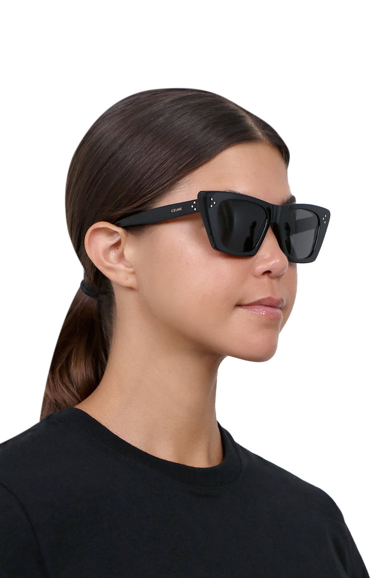 The Celine Sun 213 Sunglasses in Shiny Black/Smoke are crafted from an acetate with smoke lenses and a cat-eye frame. This style is finished with the signature CELINE logo at the temples.