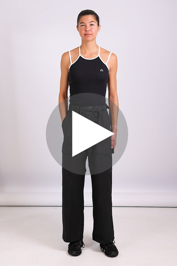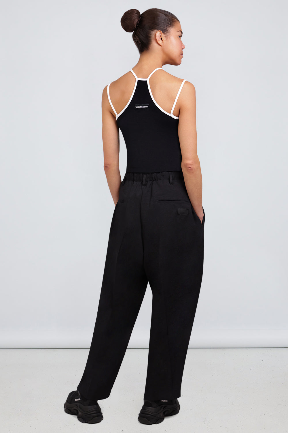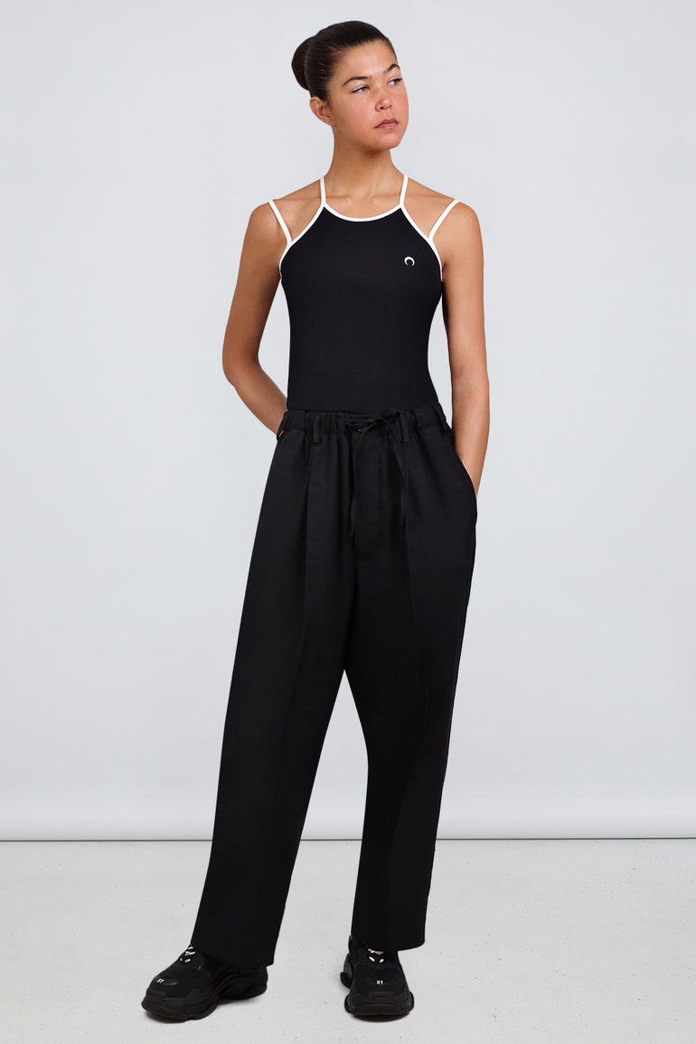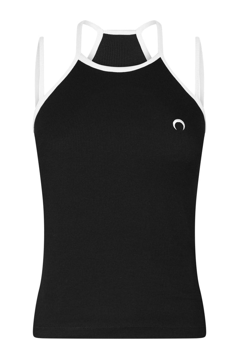 The Marine Serre Tennis Court Top in Black is crafted from stretch organic cotton, the Ribbed Cotton Top features a round neck with contrasting trim and spaghetti straps.