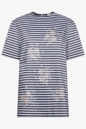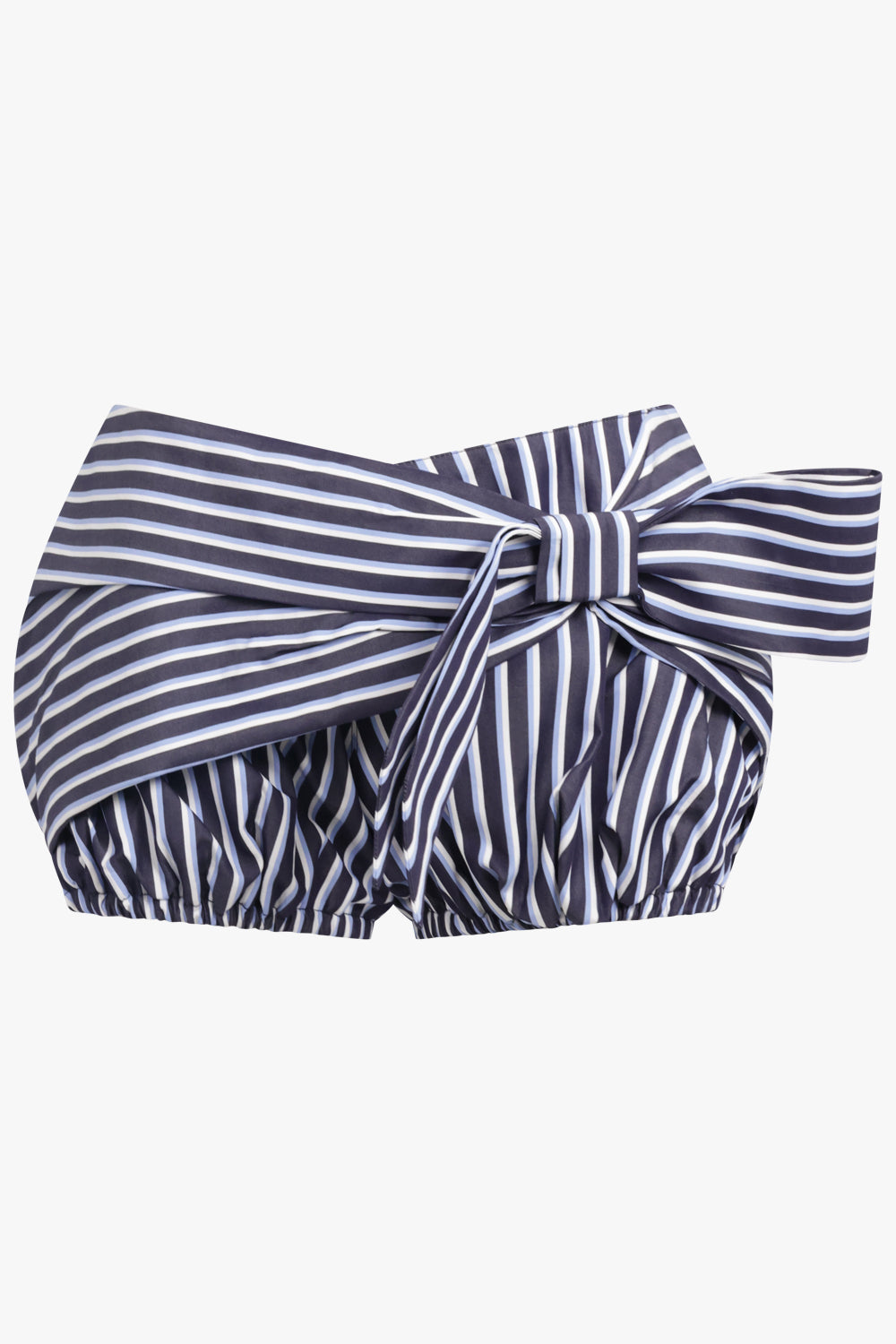 Elevate your summer wardrobe with Rabanne's Tie Front Stripe Bloomer Short in Blue/White. This sleek and stylish mini-length short features elegant pin stripes and a delicate side bow accent. Designed with a cheeky fit and elasticated legs for comfort, it also boasts a hidden zipper closure for a seamless finish. Embrace luxury and sophistication in these must-have shorts.